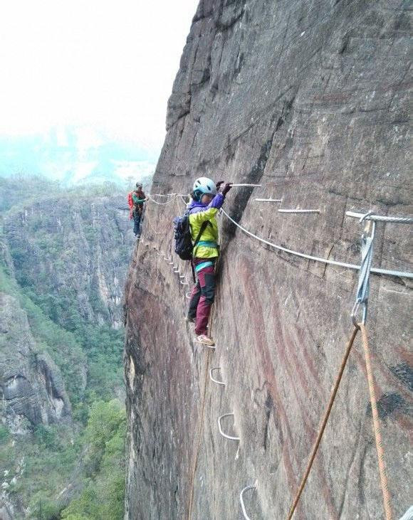 山面上会由扶手横梯、固定缆索、岩石塞、踏脚垫等构成爬山径道,就算是毫无经验,也能攀上悬崖峭壁。