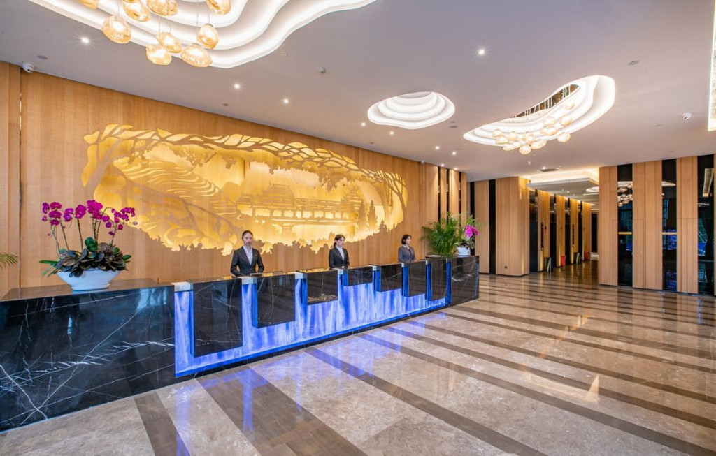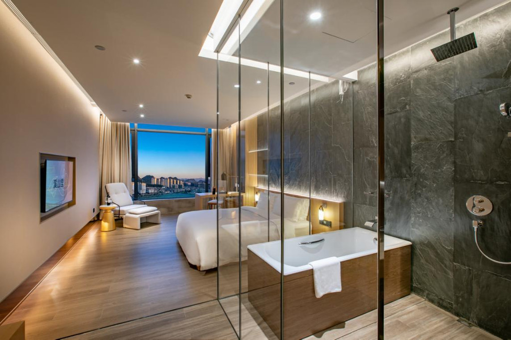 酒店客房的石材均取材于贵州省东北部石阡县,挑选的石材为海棠花且水纹痕迹较多,天然而不造作,自然而不艳媚。这种石材在一般人眼里也许是不起眼的石头,但初见该石材,惊叹于大自然的鬼斧神工。以素为美,以枯为美,以寂为美,以缺为美,以真为美,这是一种不刻意突出装饰和外表,强调事物质朴的内在,并且能够经历时间考验的本质的禅寂之美。