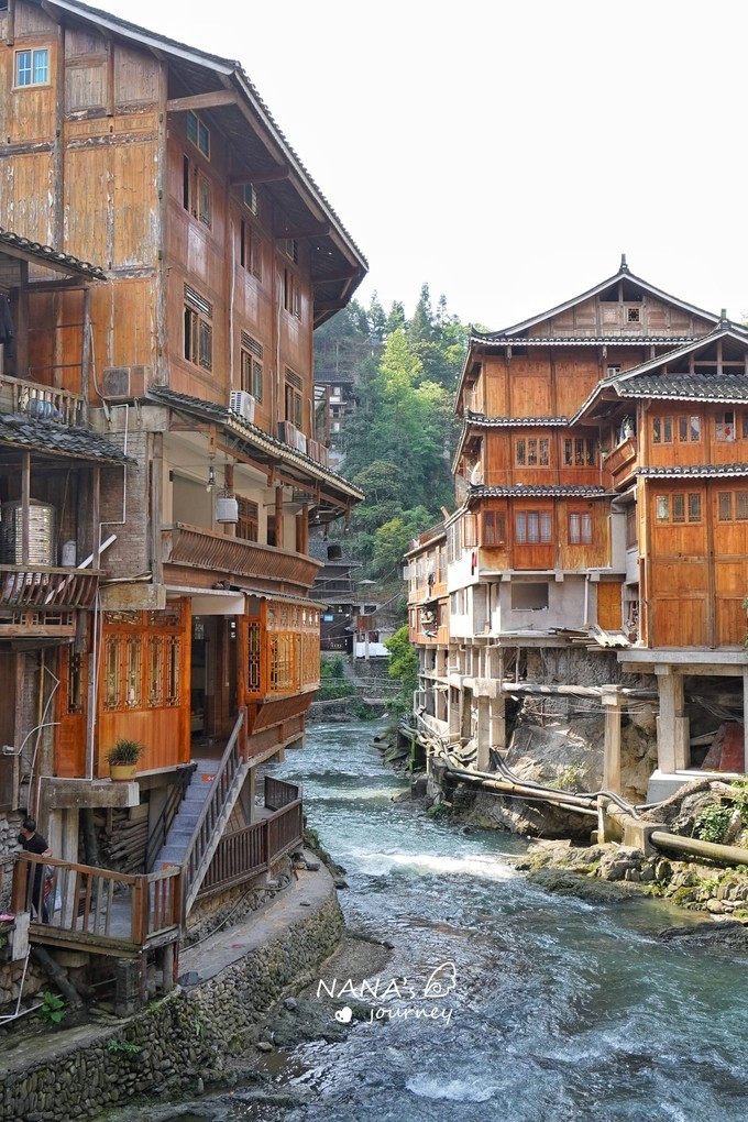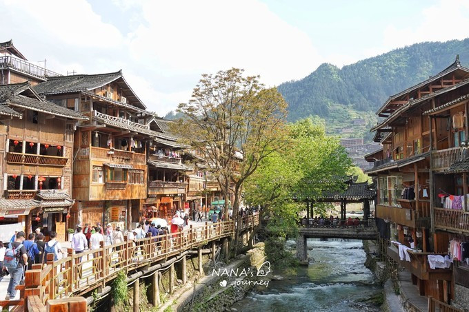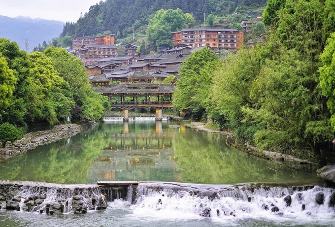 西江是典型的山谷型地貌,中间有一条 白水 河穿梭而过,而在河道上的另一个特色建筑——风雨桥,更是苗寨必不可少的组成部分了。