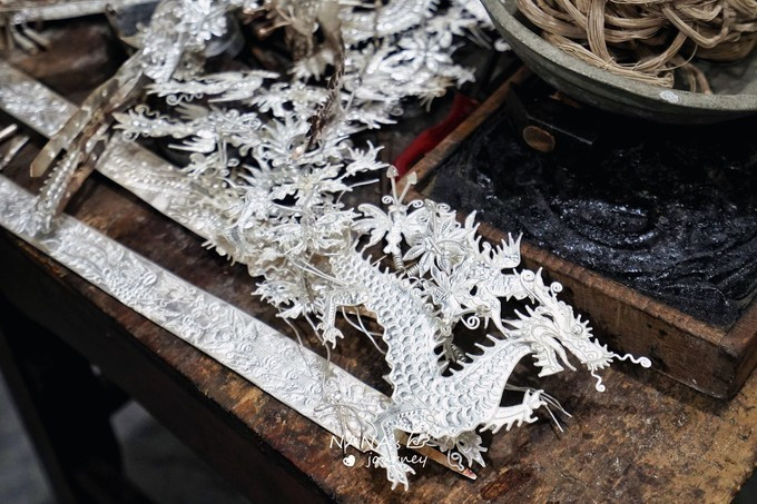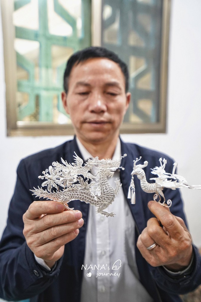 而苗银制作,大多都是成套的,吴水根说,整一套置办的银饰要做40天,一年也做不了几套。可见这些银饰都是用于喜庆的置办,多以龙凤为主题,可以想象到成品的精致。