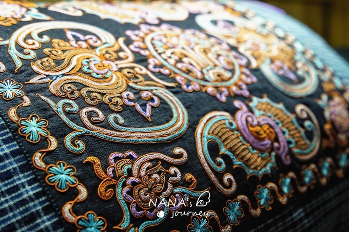 最常见的便是日常的服饰之上,虽然不是大面积的刺绣,但衣服的领口、袖口都有着精致的马尾绣,有着点睛之笔的意思。