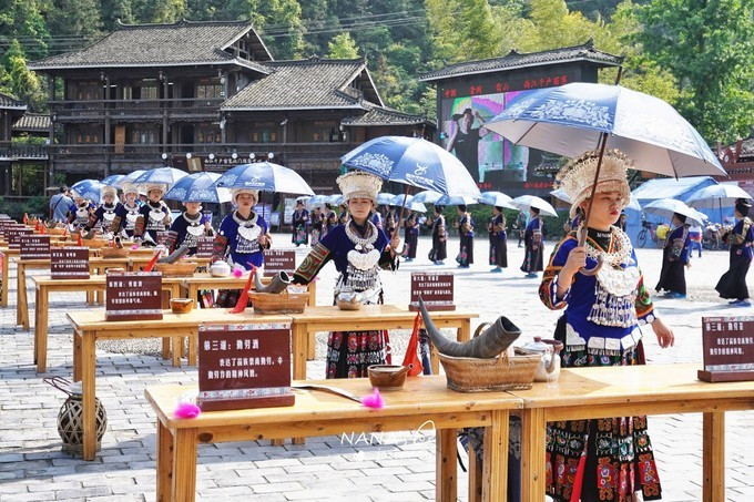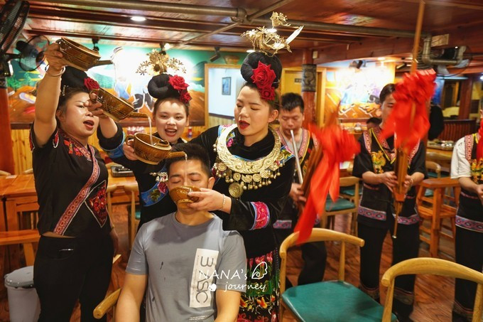 “高山流水”是苗族接待贵客的最高礼遇,意为把客人当知己。苗族人的热情体现在了这里,山有多高,谁有多长,酒坛就有多深~