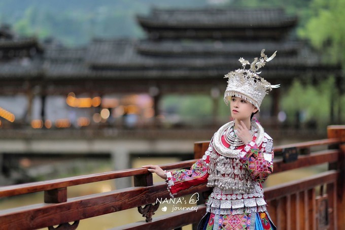 苗族服饰租借一般是半小时为单位,拍照可以选择吊脚楼或者风雨桥。