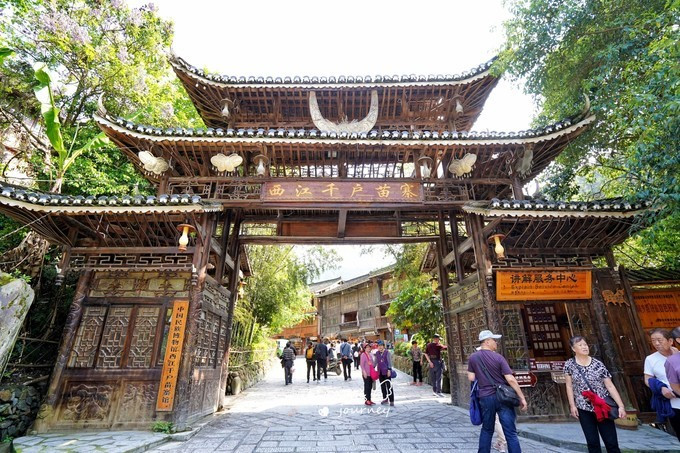 依旧是接驳车盘山而入,气派的大门迎接了我们的到来,这个季节的西江已经人山人海,下午到的我们,冲在人海中,进入了这个神秘又有趣的苗寨中。