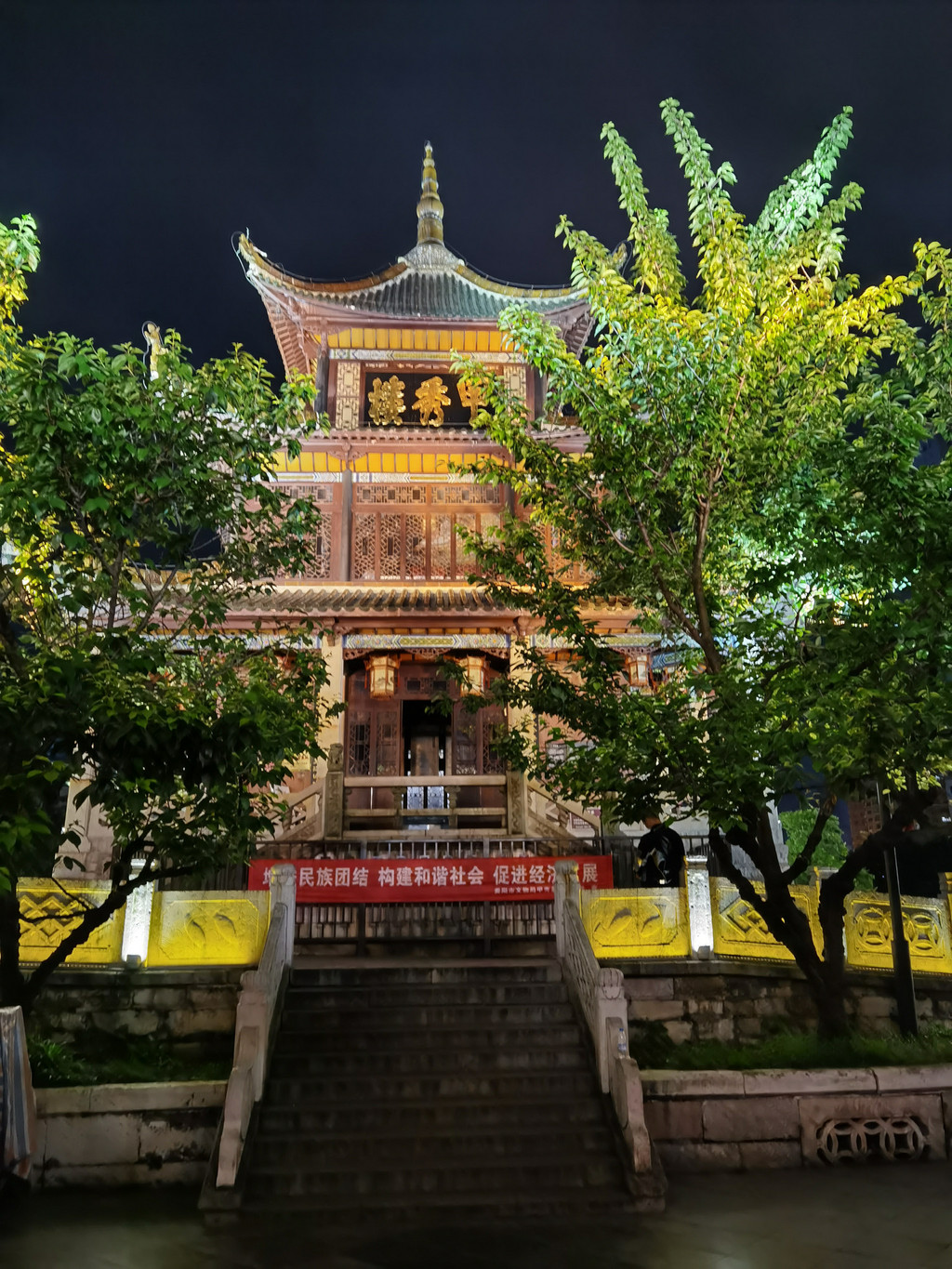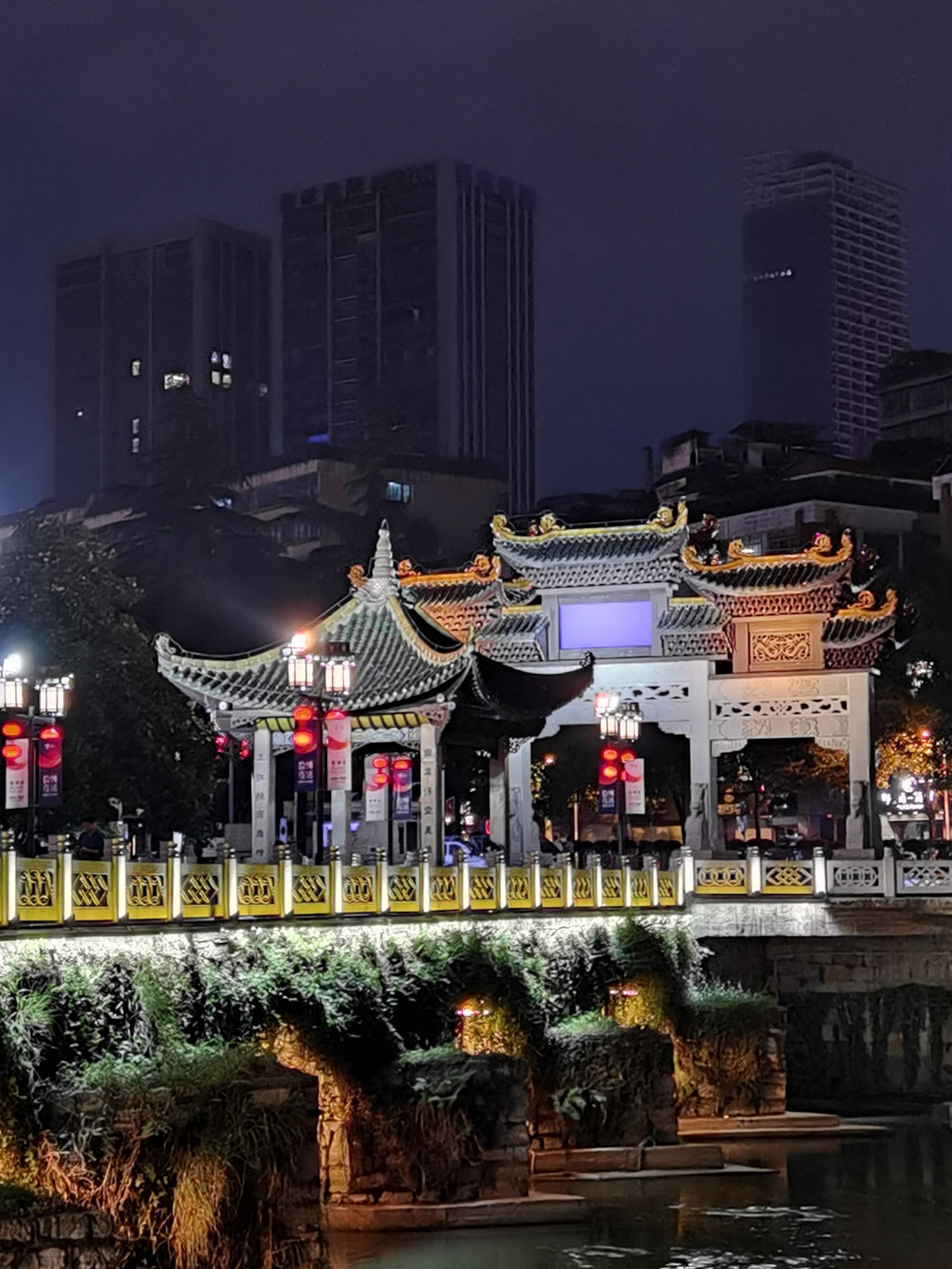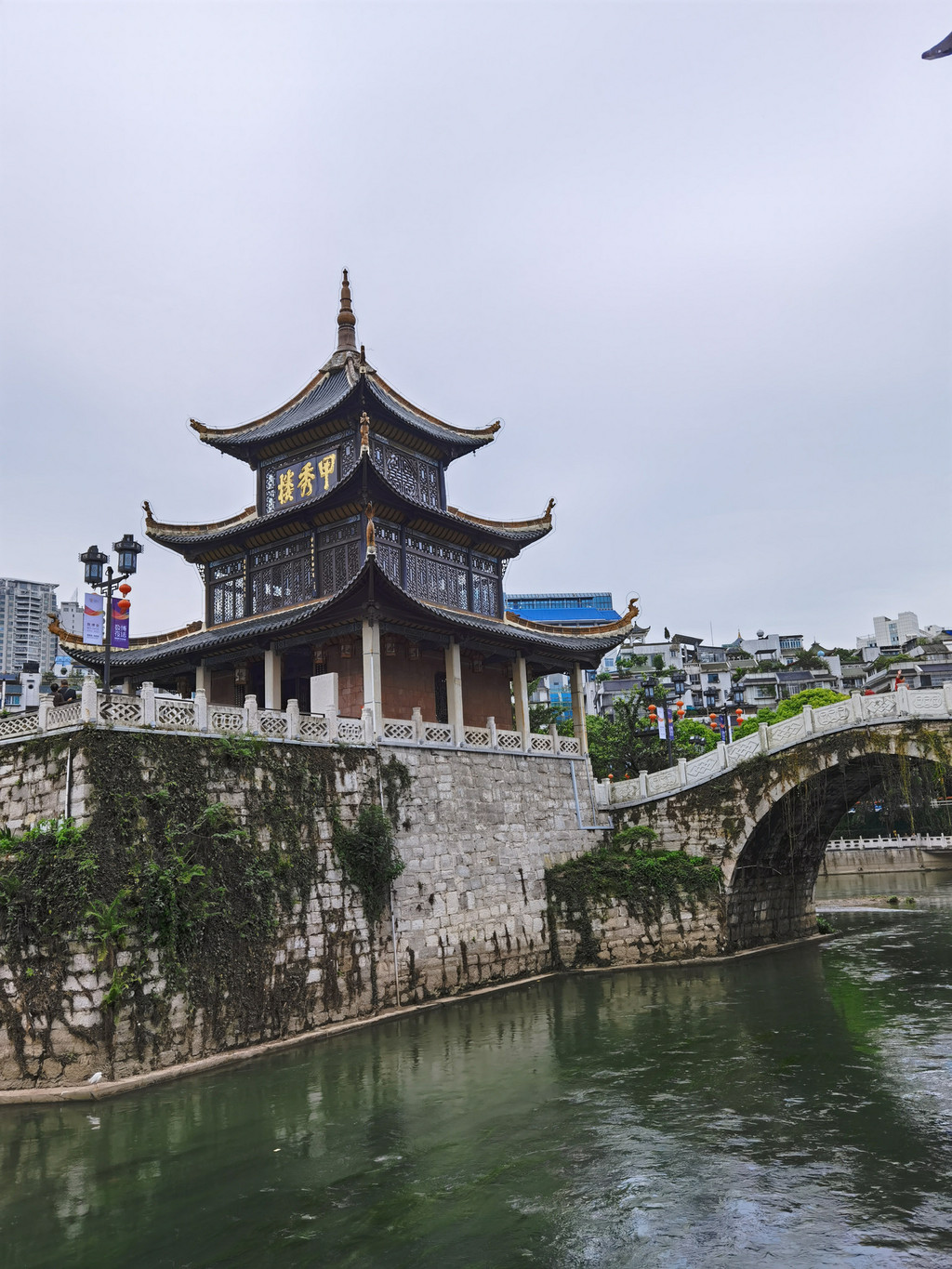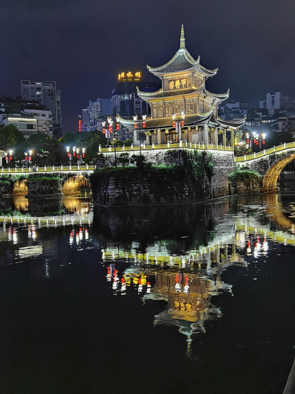贵阳的城市封面则非甲秀楼莫属。记得我上小学时,收集烟盒时,就有一款香烟是甲秀楼。这座始建于明朝万历年间,别具匠心地选址在南明河中的一块巨石(鳌矶)之上,依靠浮玉桥与两岸相连,故有“鳌矶浮玉”之称。每逢夜幕降临,这座三层三檐四角攒尖顶的古楼披上霓虹灯彩,倒影在南明河畔中闪现时,甲秀楼的夜景会让你流连往返,迷醉其中。