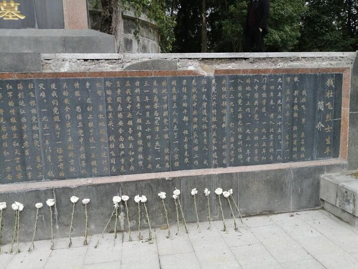 墓碑庄严肃穆,上书“龙潭虎穴建奇功 黔山秀水祭忠魂”14个字,概括了钱壮飞烈士一生的丰功伟绩和人民对他的怀念。