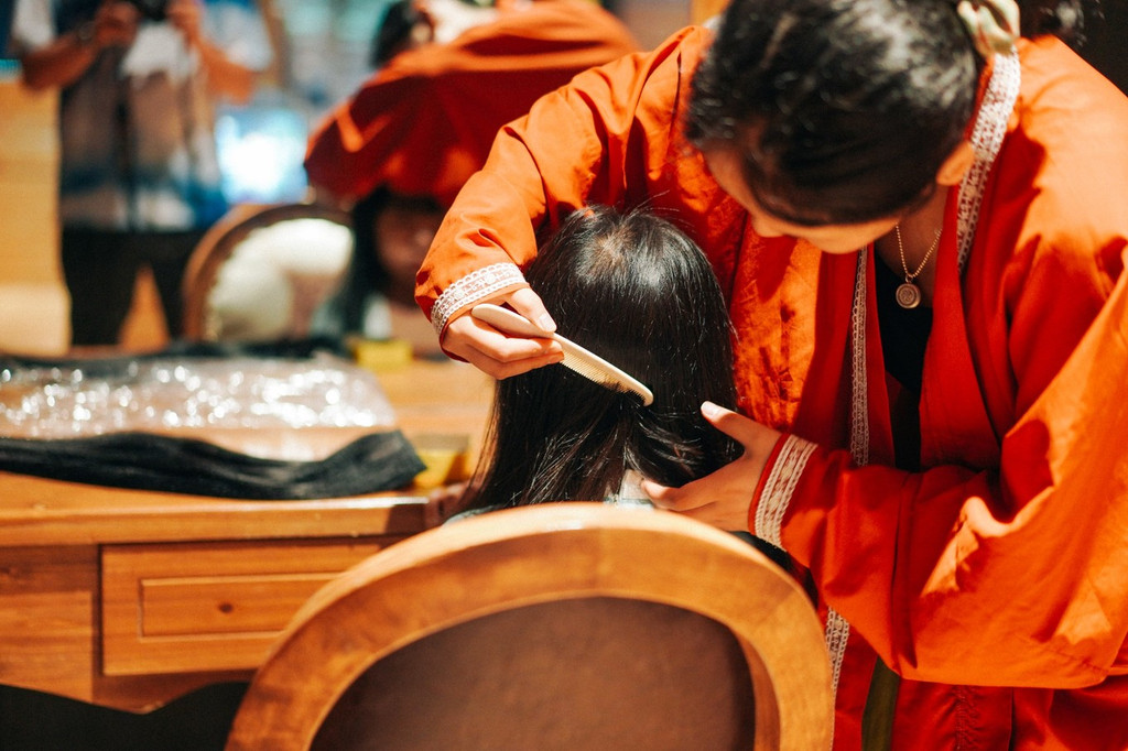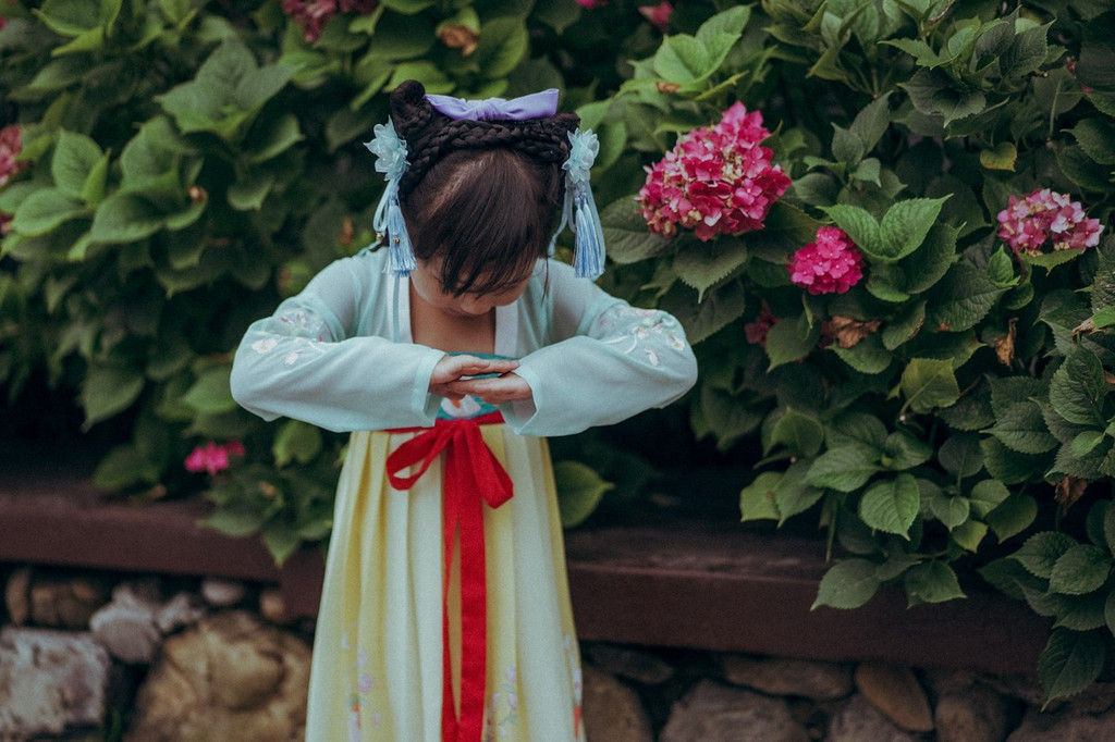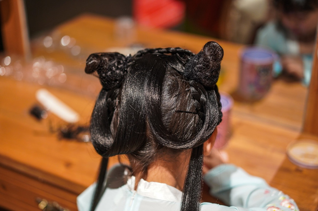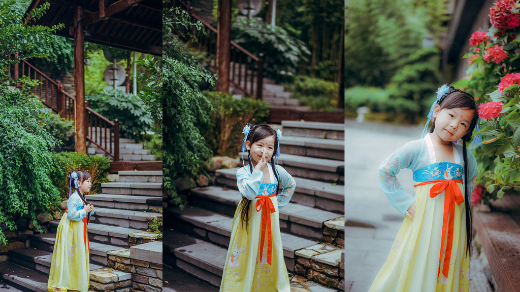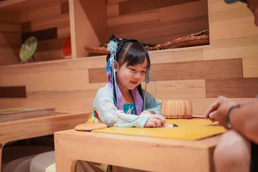 比较适合小孩子的项目也有很多, 比如 汉服体验,还有专门小姐姐给盘头,小萌也来穿了一套,真的很漂亮!