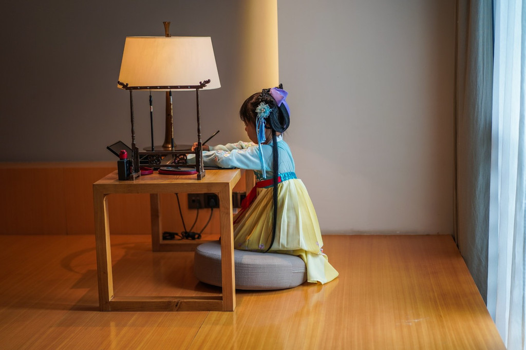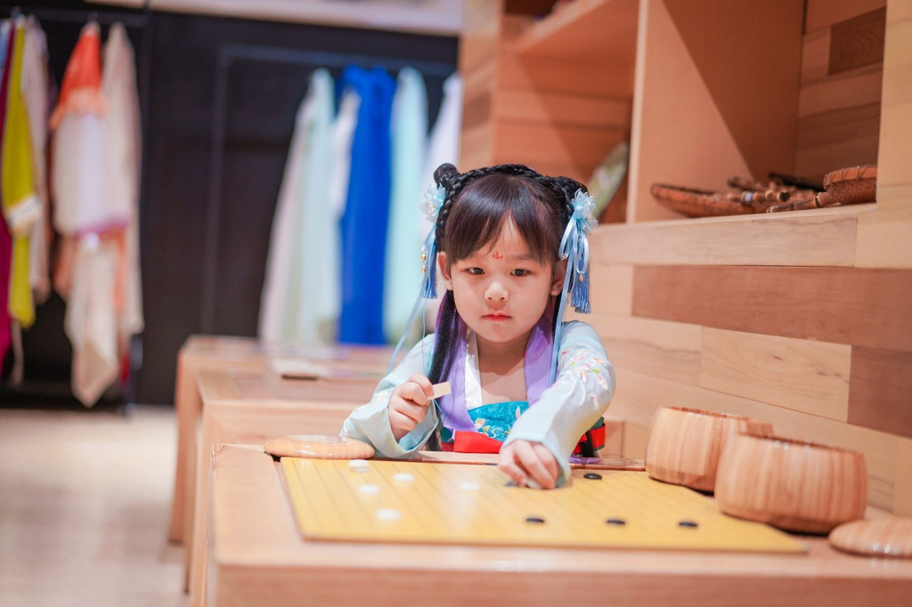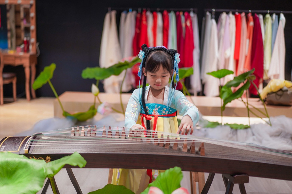 还有古筝的学习,不过孩子太小,只能穿着汉服摆摆样子。