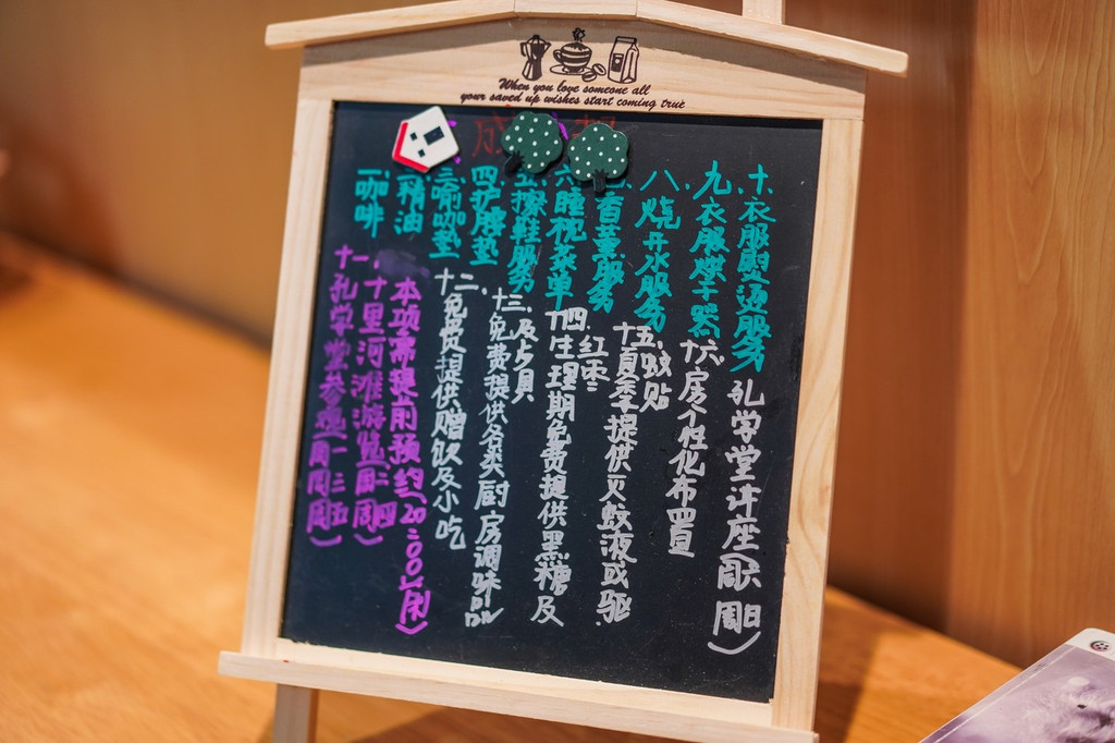 (1、咖啡;2、精油;3、瑜伽垫;4、护腰垫;5、擦鞋服务;6、睡枕菜单;7、香薰服务;8、烧开水服务;9、衣服烘干器;10、衣服熨烫服务;11、孔学堂参观(周1,3,5)、十里河滩游览(周2,4)需要提前预约;12、免费提供赠饮及小吃;13、免费提供各类厨房调味品 14、生理期免费提供黑糖和红枣 15、夏季体会灭蚊液和驱蚊贴;16、房间个性化布置;孔学堂讲座(周六、周日)