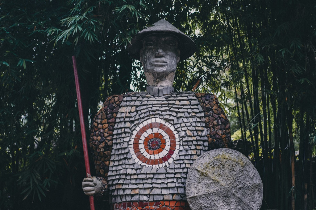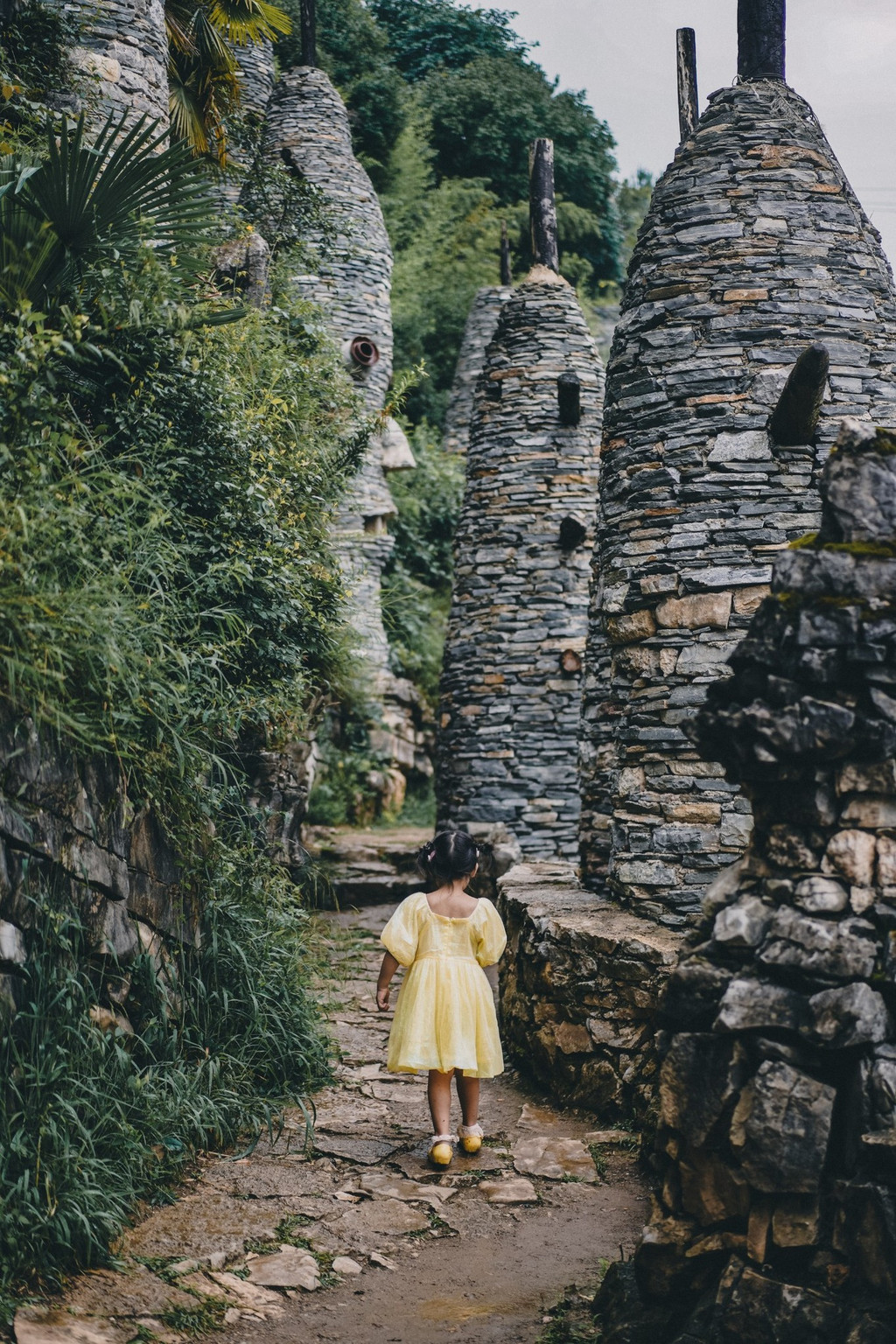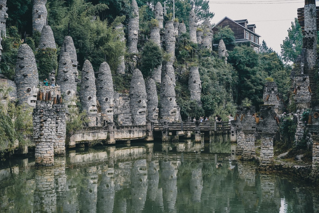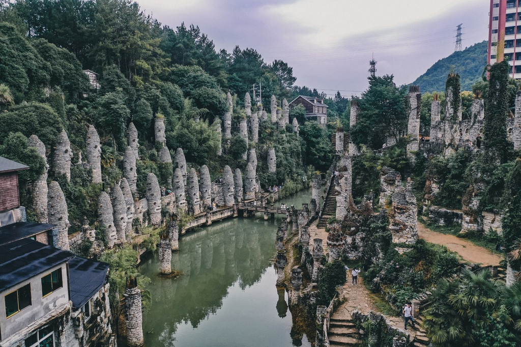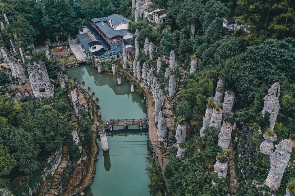 夜郎谷的城堡、小桥、房屋,通往各地的路阶都由石头堆砌而成,都是宋培伦自己设计并参与建筑的。
