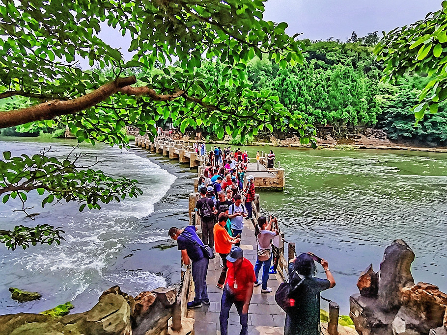 来到石桥上不少游人驻足拍照,位于石桥北边的陡坡塘瀑布隐约可见。