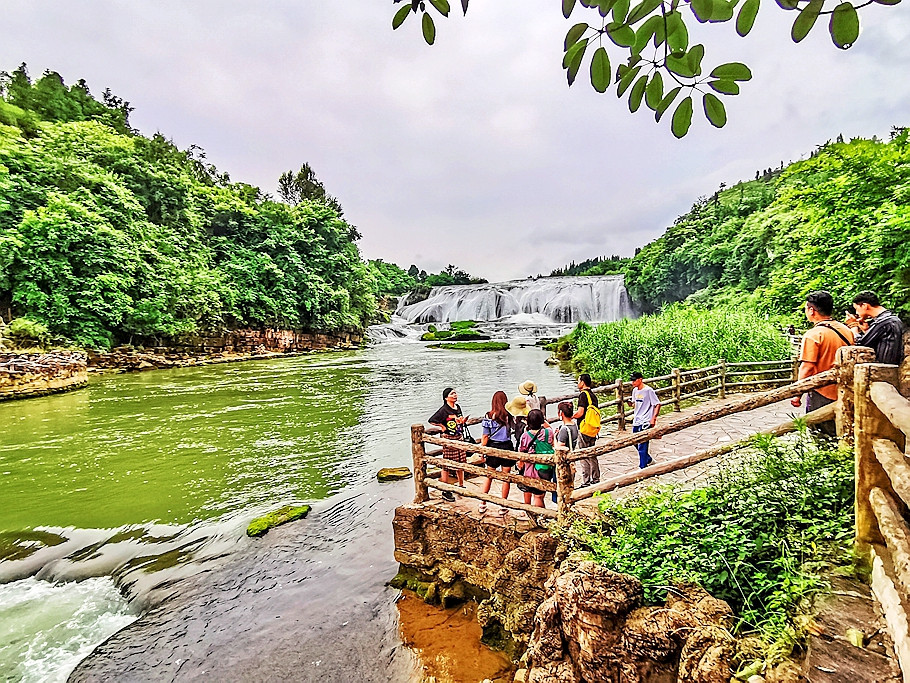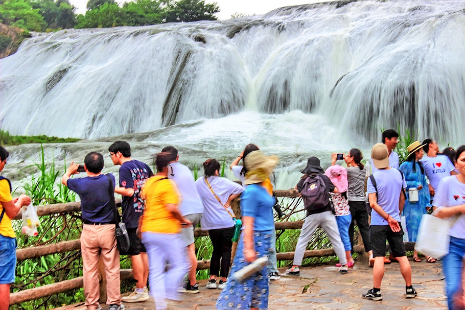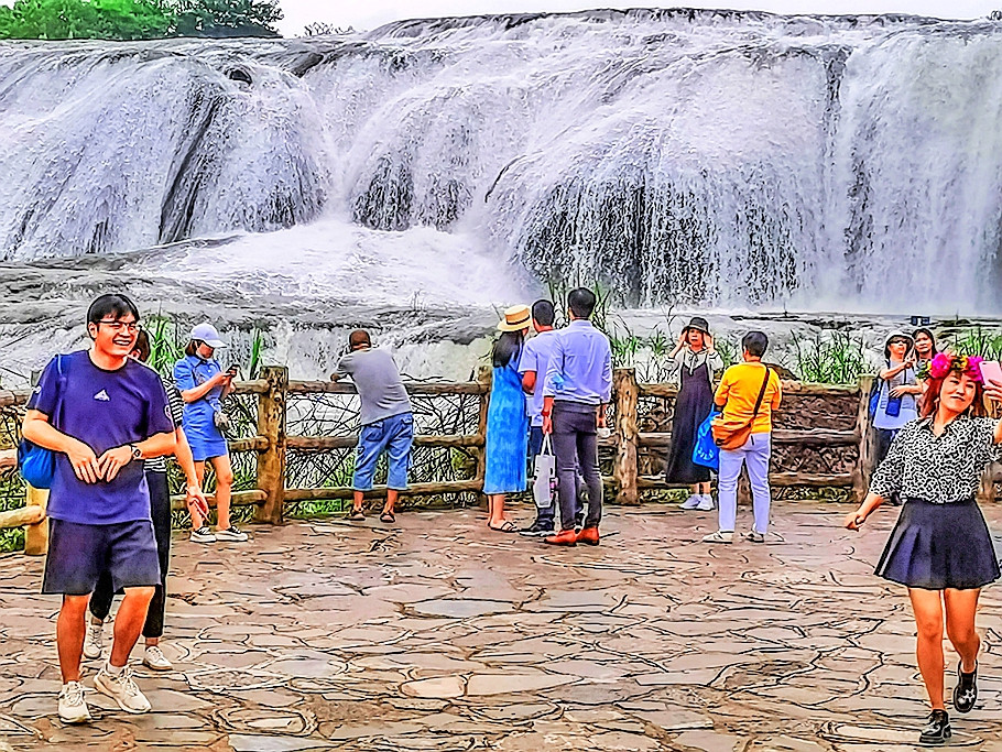 来到平台上观赏,前方还有一个外筑的平台,那儿离陡坡塘瀑布更近,密密麻麻的游人也更多。