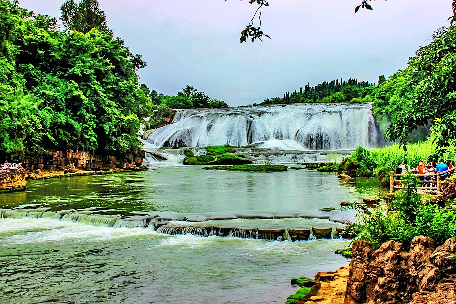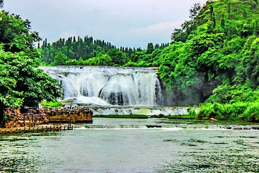 陡坡塘瀑布是黄果树瀑布群中最宽的瀑布,经典电视剧《西游记》片尾曲开始的镜头,师徒四人从一条宽阔的瀑布上走过,这一场景便是陡坡塘,你还记得吗?