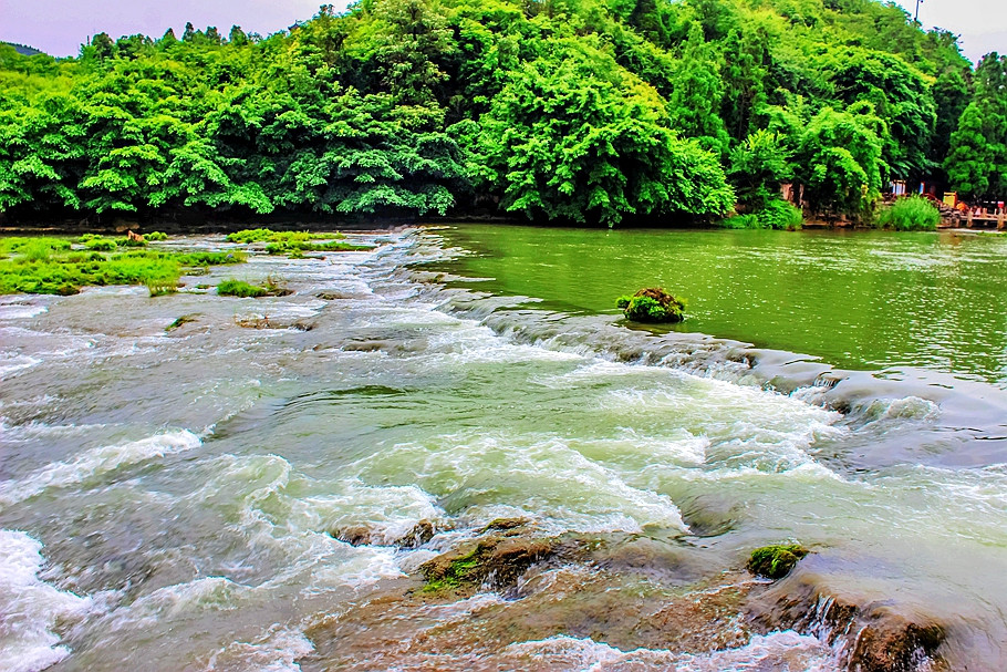 这儿有排列有序的大石块伸向河中央,已经被河水淹没。为安全起见,河边筑有的石栏杆不让游人下去踩踏。