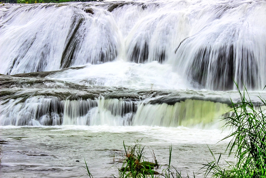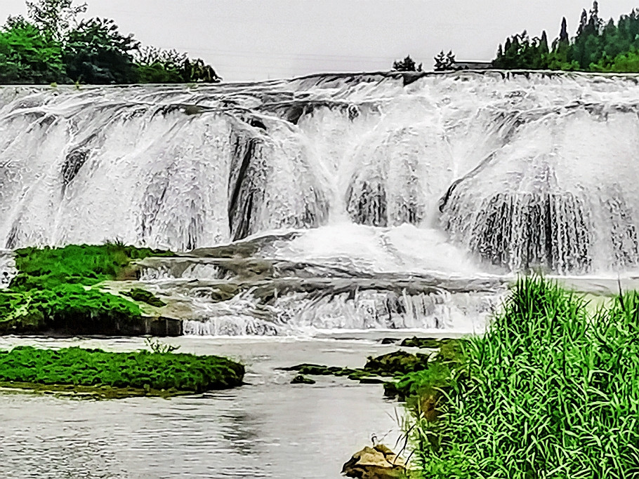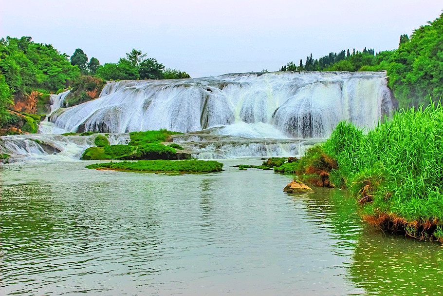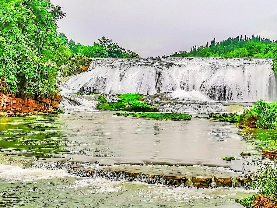 21米高的瀑布,宽宽的瀑顶,逶迤105米,它是黄果树瀑布群中瀑顶最宽的瀑布。陡坡塘瀑布顶上是一个面积达1.5万平方的巨大溶潭,瀑布则是形成在逶迤100多米长的钙化滩坝上。