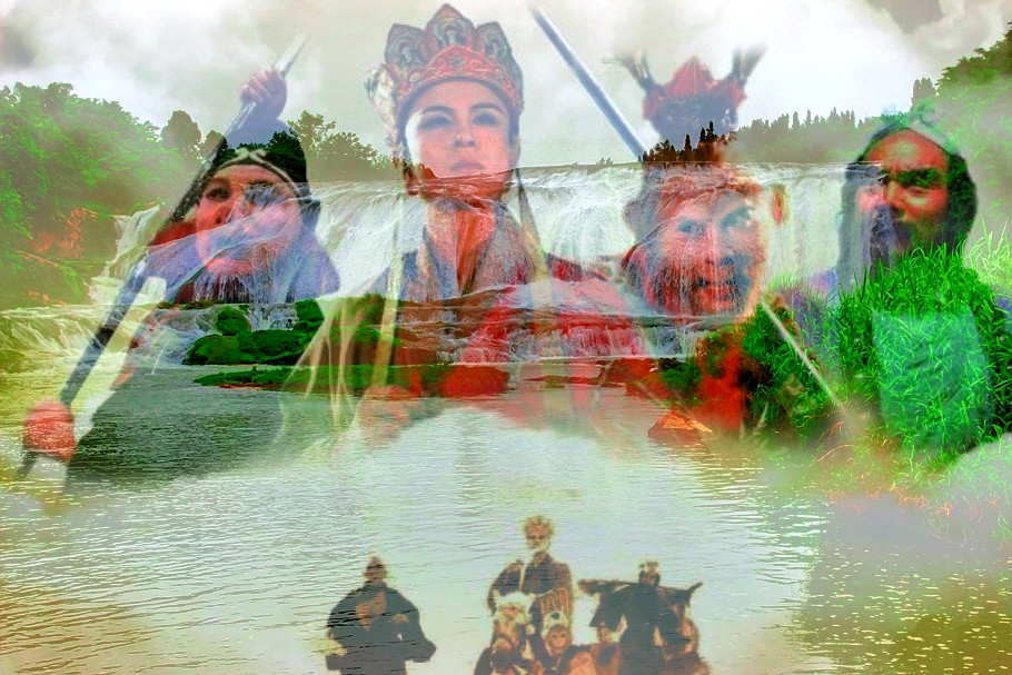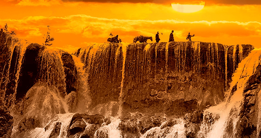 耳边响起耳熟能详的主题曲“敢问路在何方?路在脚下”,西天取经的唐僧师徒4人,仿佛正在逶迤100多米长的钙化滩坝的瀑顶上通过......