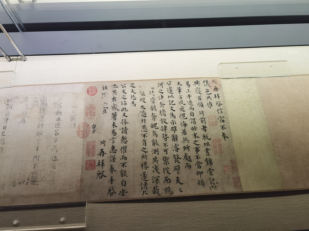 吃过师傅推荐的酒店对面的一家味道不错牛肉粉(北方人还是要选白汤,红汤的会让你大汗淋漓),就赶往贵州博物馆。免费开放需提前在网上预约,现场也可扫码约,但是人太多太乱还是提前做准备的好。馆里没人付费的人工讲解,但是有几个时段的免费讲解,14:30我们这好赶上太幸运了。有人讲解就是不同,观赏了多民族的民风民俗后,上到顶楼对一个喜爱历史和书法绘画的人真是看到了宝藏。唐伯虎、郑板桥、齐白石、张大千的绘画,刘墉、林则徐的字,还有照片中的这幅字看看上面的印章就知道它的宝贵之处。这件衣服是宋代的蜡染,如此靓丽精美,不带奢华之气但又处处透露着高级。宋代真是中国历史上一个艺术巅峰的时代。