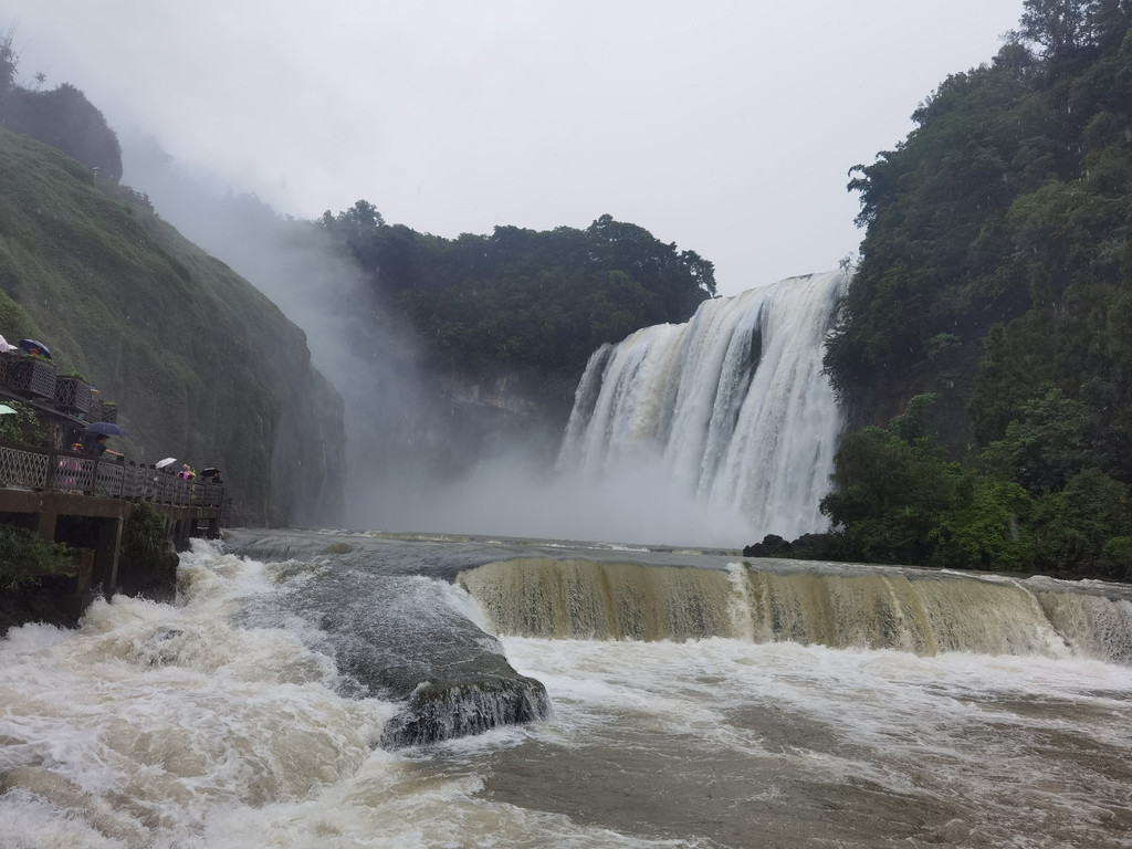 如果说小七孔的水具有小桥流水般温婉之美,那黄果树就颇具粗犷硬朗之美。加上刚下过大雨,滚滚白浪间带着些许泥沙,让人不敢靠近。