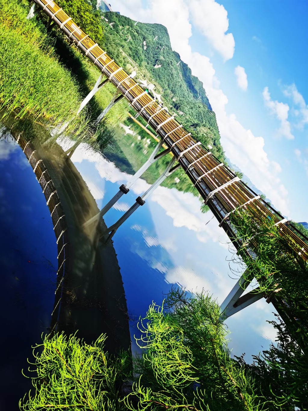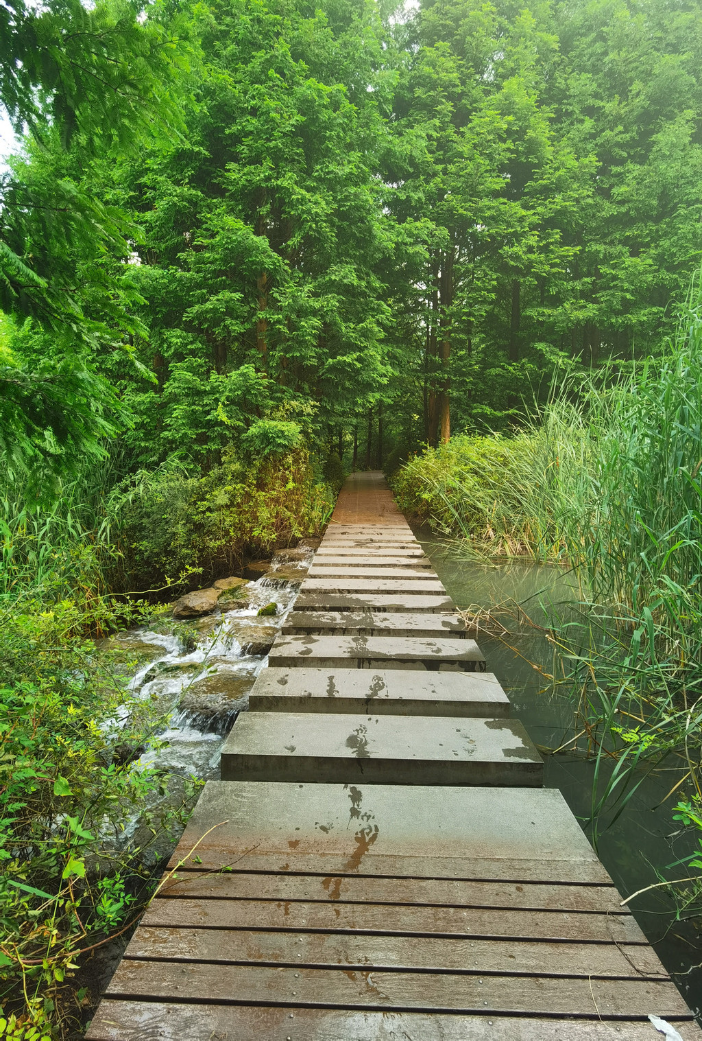 明湖湿地公园不大,就在核心区钟山区,乘坐公交车就可以到了。六盘水师范学院就建在明湖湿地公园旁,湿地公园一侧紧挨着梅花山索道(后来坐索道可以俯瞰整个湿地公园)。沿着公园标注的步行栈道一路走下来大概需要半个多小时,湖面上有一驾彩虹桥,蓝天白云时可以看到倒影,非常好看。我去的时候正好下雨,图片是盗用了偶遇的一个姐姐的,嘻嘻