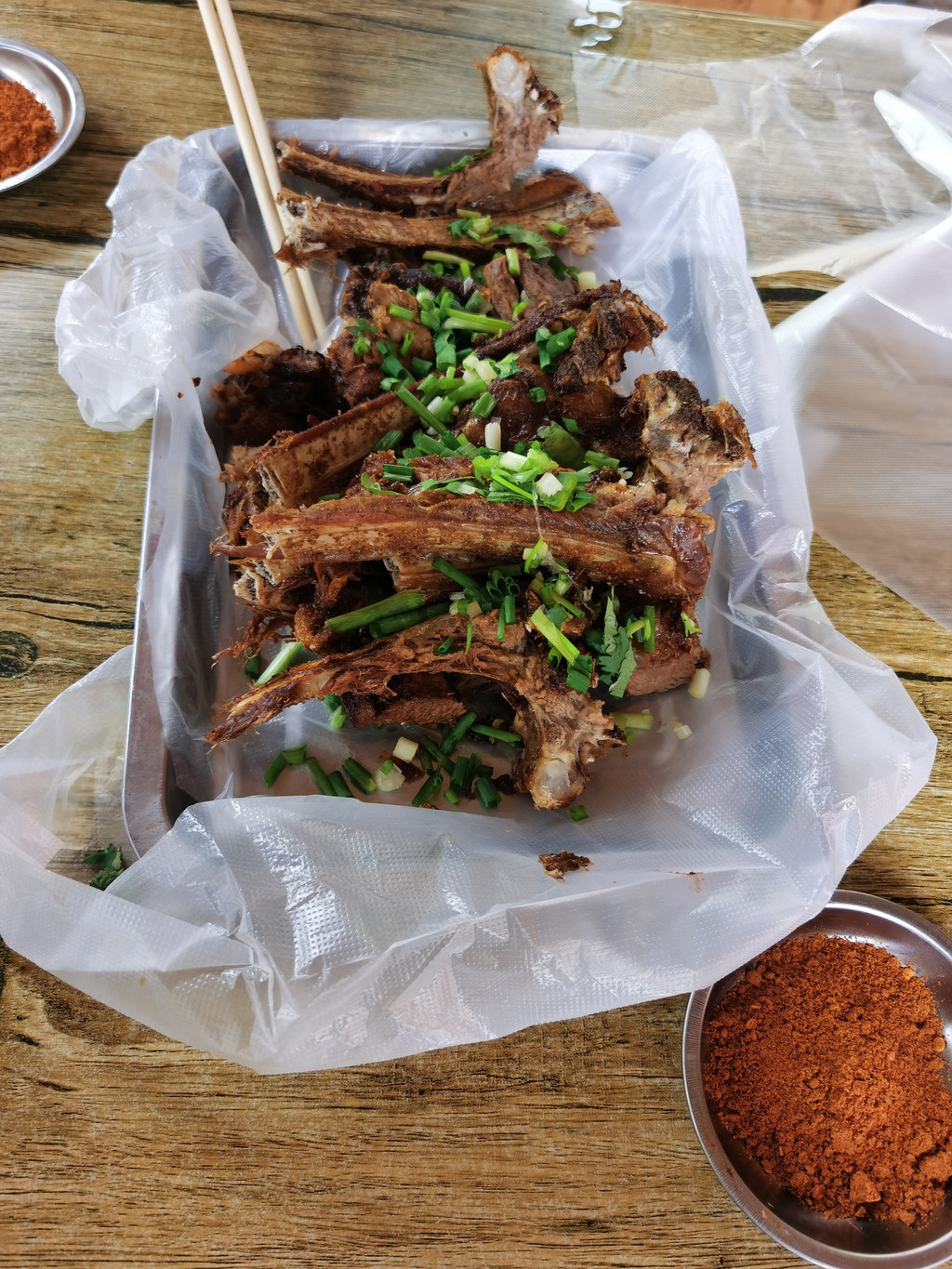 沿途的风景我觉得一般般,有个湖,还有滑雪场(去看看场地而已,也没啥),大概1点多我们在路途中吃了午餐,是司机推荐的当地人摆摊的烤羊肉,我们点了2斤羊排,烤的非常好吃,80元一斤,如果烤整只羊可以便宜到50元/斤。真恨自己没有车,回去时托上几斤羊肉回去。当地的牛羊基本都是吃草长大的,味道纯正好吃极了。
