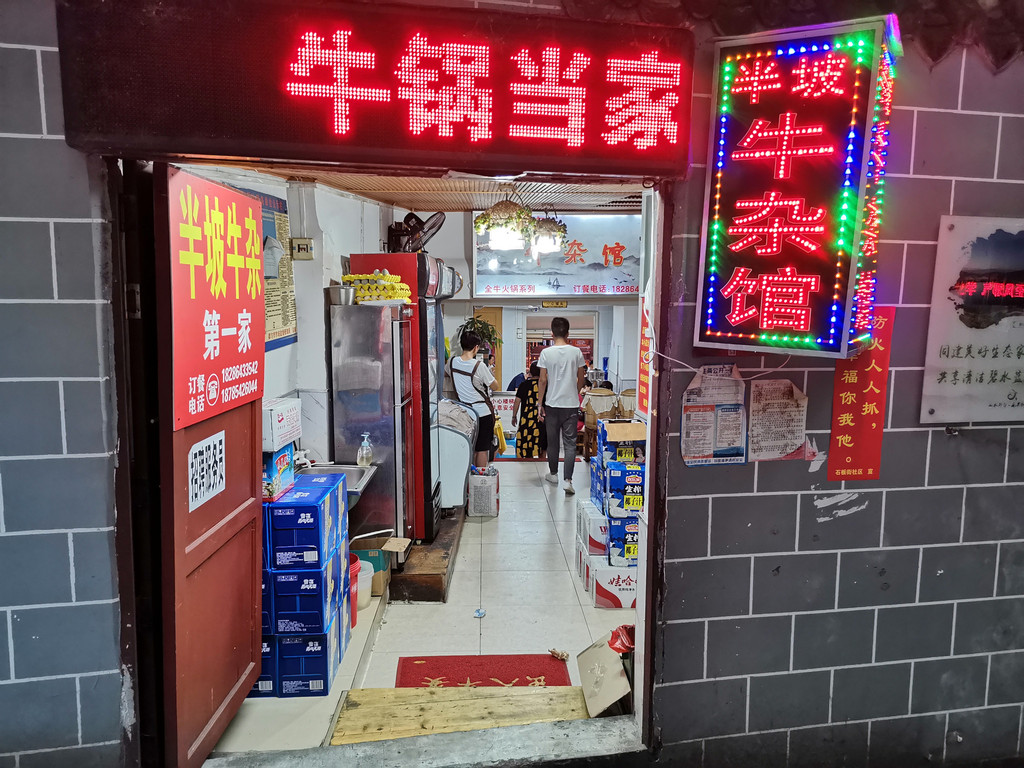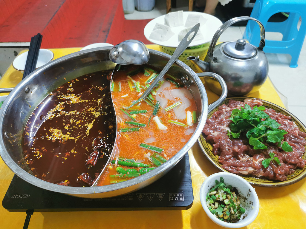 朋友特意提醒我们,都匀的牛肉很好吃,于是,我们根据酒店前台的推介,找到这家路边小店,六点去时已无空位,出去逛了一个多小时返回,觅得一张小桌,要了一个鸳鸯锅,一斤半牛肉,美美地吃了一顿,火锅味道其实也就一般,但是牛肉真是很新鲜量足。都匀的另一道地方名菜是“虾酸牛肉”,我们在石板街遇到一家店子,看着前面几位年轻男女进去不久就皱着眉头捂着口鼻走了出来,说闻不惯那味儿。我们也进去看了看何为虾酸牛肉,结果也被熏了出来,那味道,真是格外酸爽。其实我是想试试的,没准就像榴莲一样,闻着臭,吃着香呢。但是老公坚决不允,只好作罢。