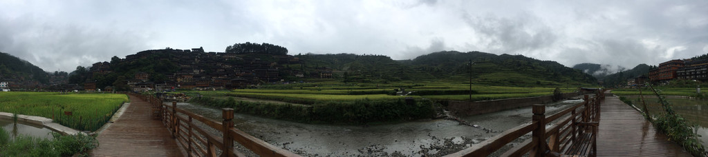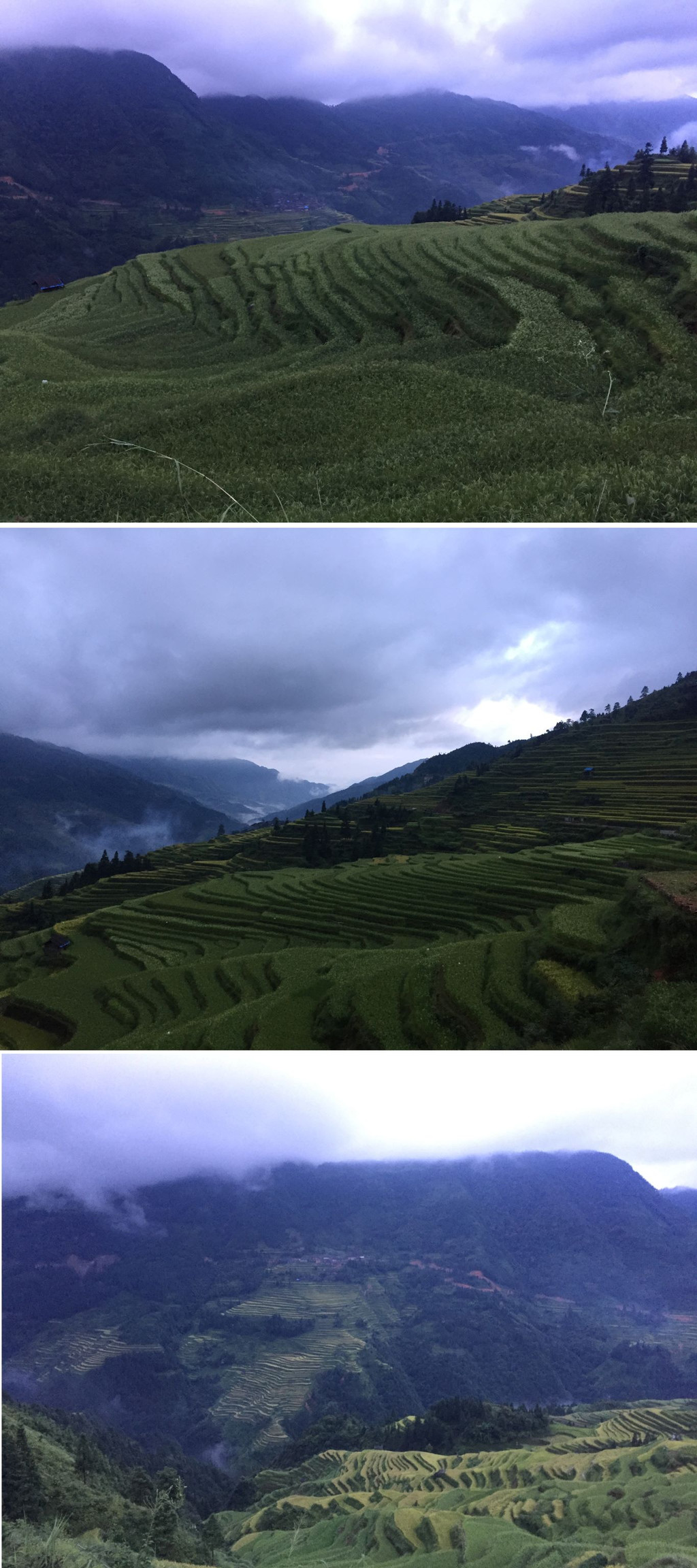 从西边靠近酒店位置的视野,东北面的山坡密密的村寨,照片正中临河的那个大建筑物就是歌舞表演场;天气又有点下雨,依旧决定先去照片最右侧的梯田;