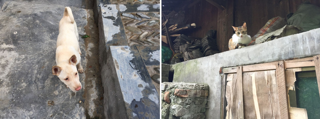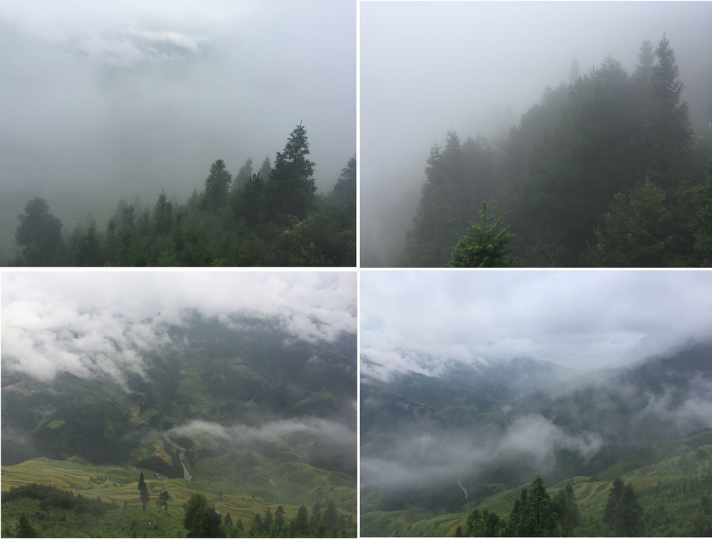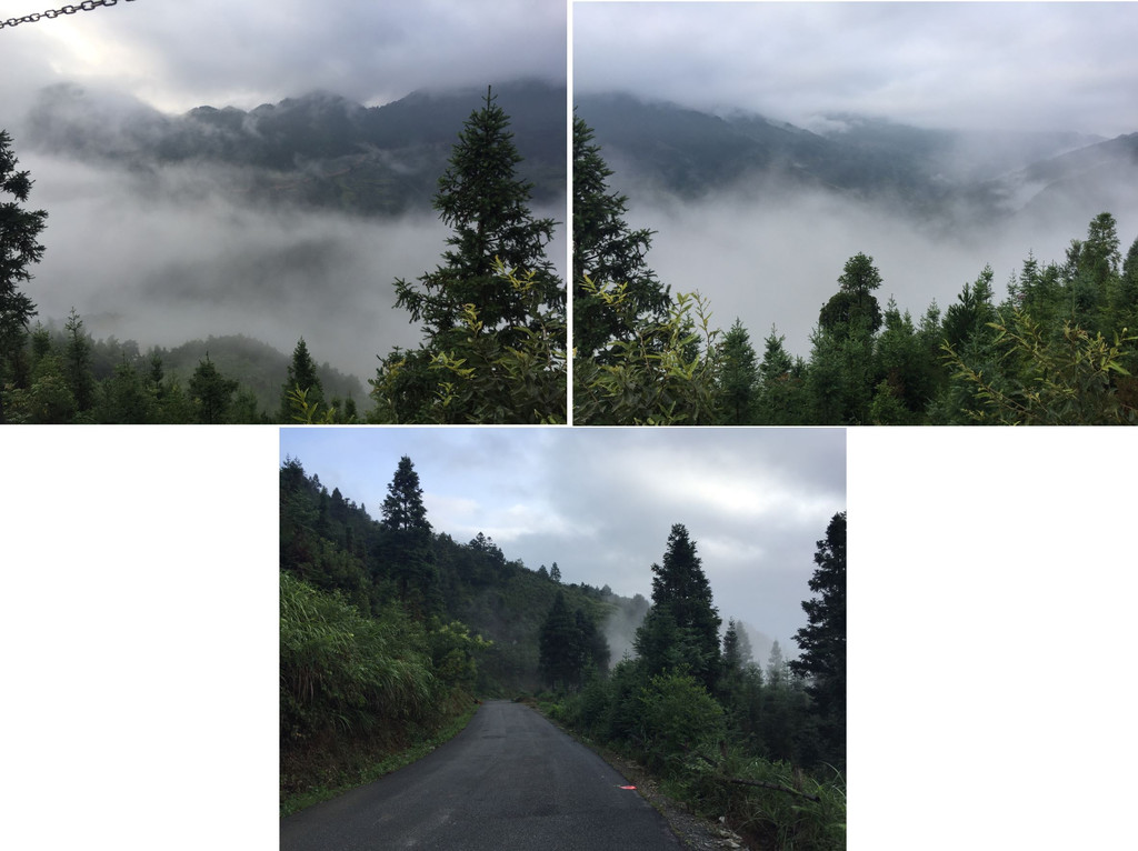 窗外依旧是大雾弥漫,民宿外大路的两边也是水汽缥缈;同住的几个女生拿出了一个无人机,直接从民宿的观景平台飞出去,在云雾上掠过,景色极佳;没有吃民宿的早餐,去村子里找早餐,小村里就一家早餐店,卖粉的,用油渣做的浇头,味道一言难尽啊,不好吃;早饭出来又碰到之前的带我们的那对老夫妻,他们要走到党扭路口再回来,来回20公里啊!我们也决定往那个方向走走;