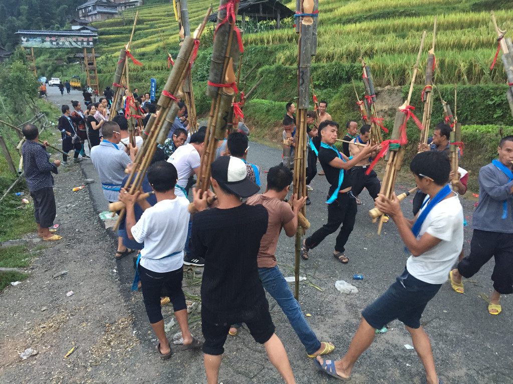 下到大路,看到更多的村民聚集在路上,吹笙箫、放鞭炮,非常热闹;