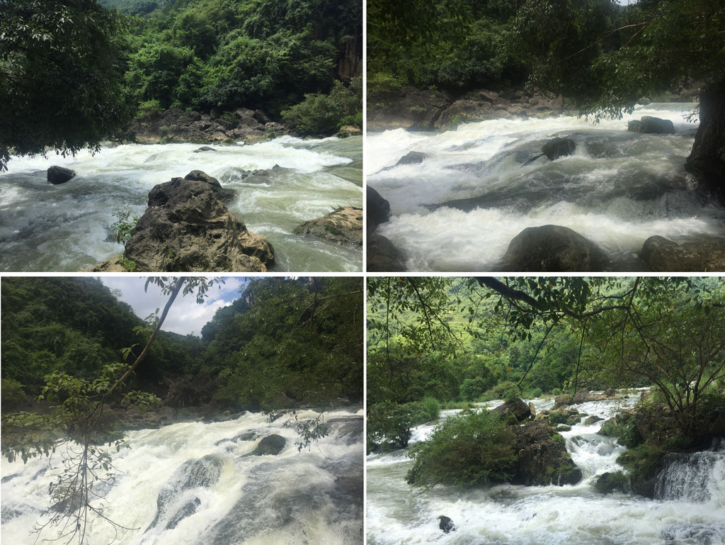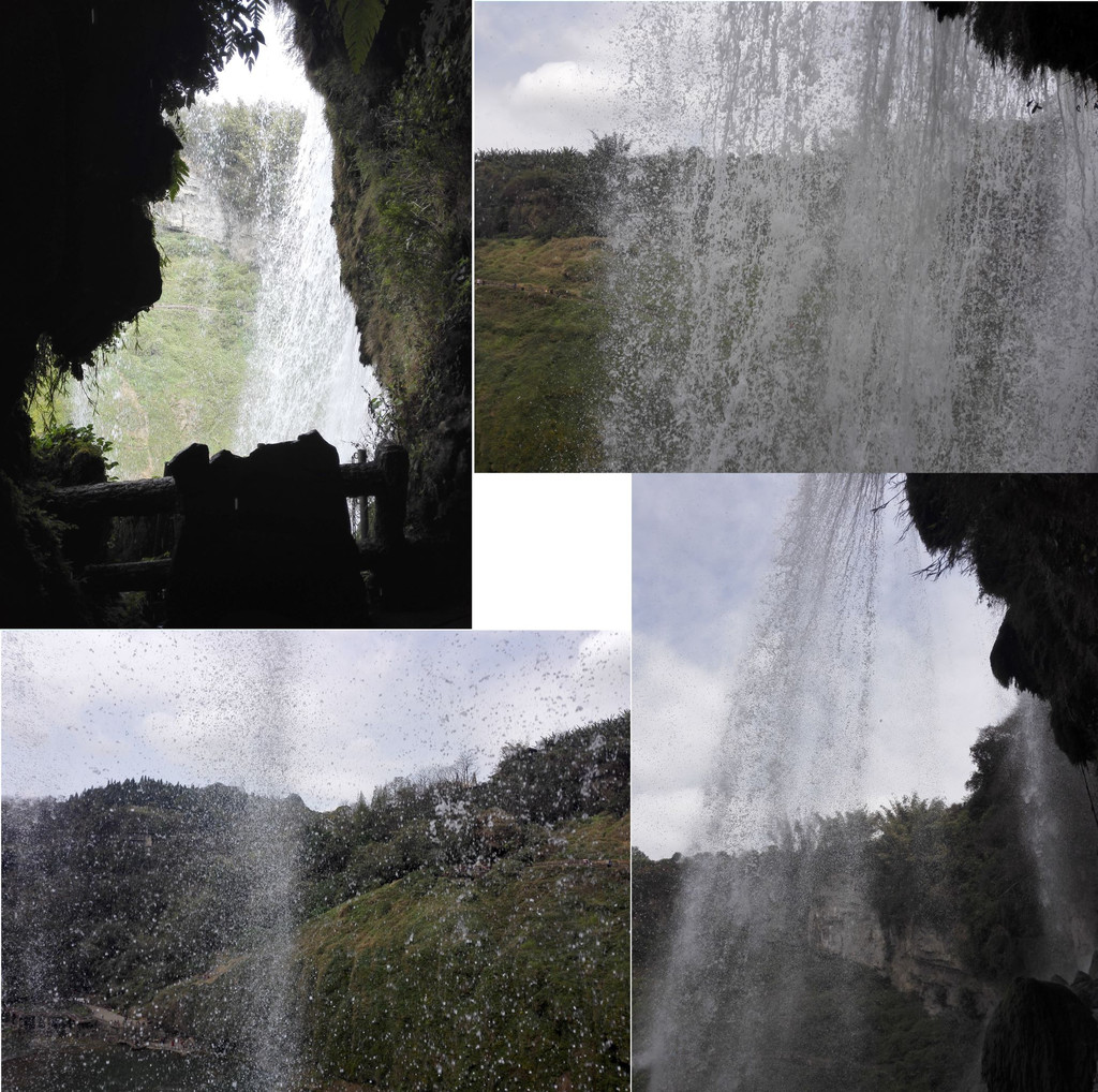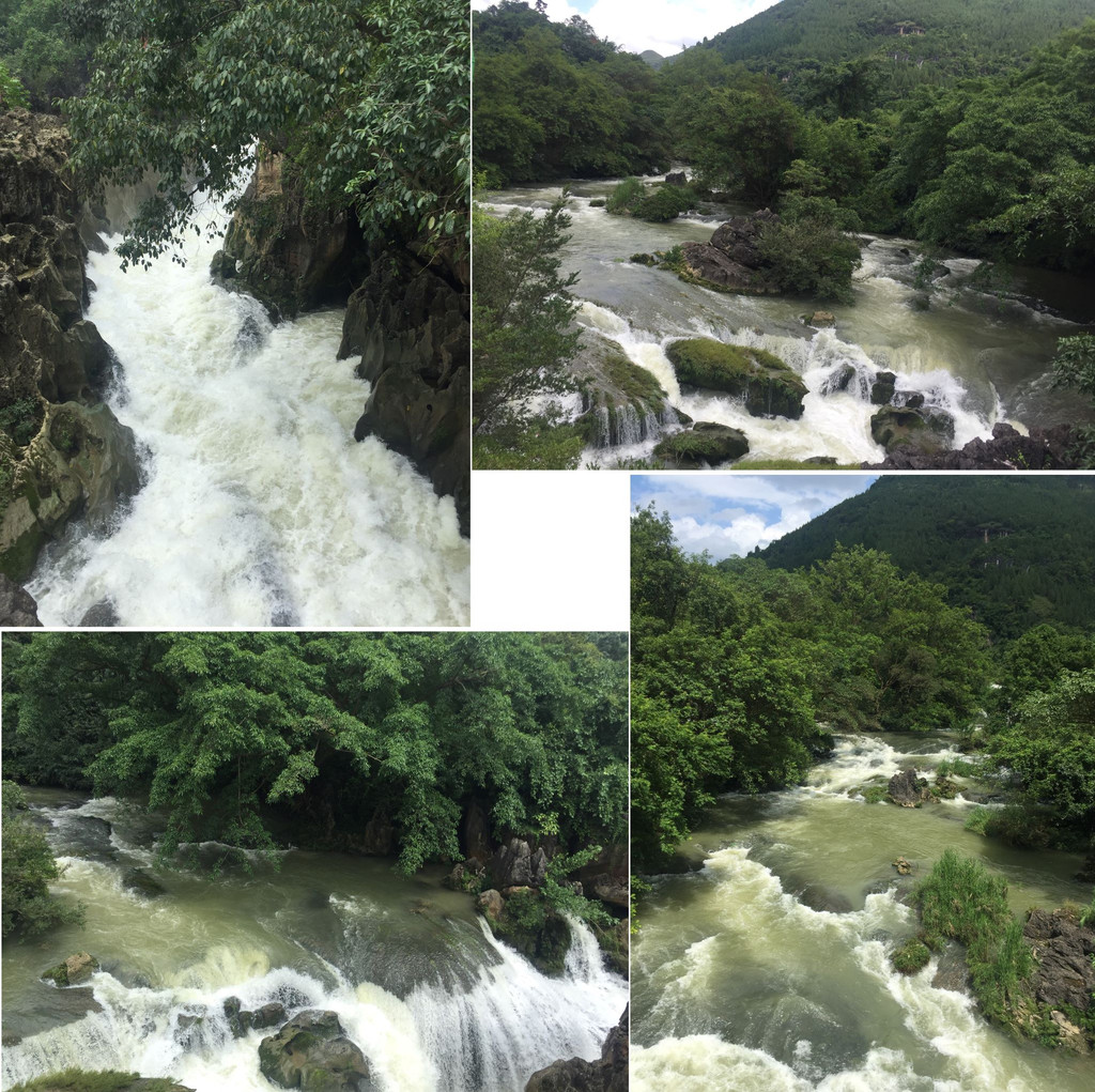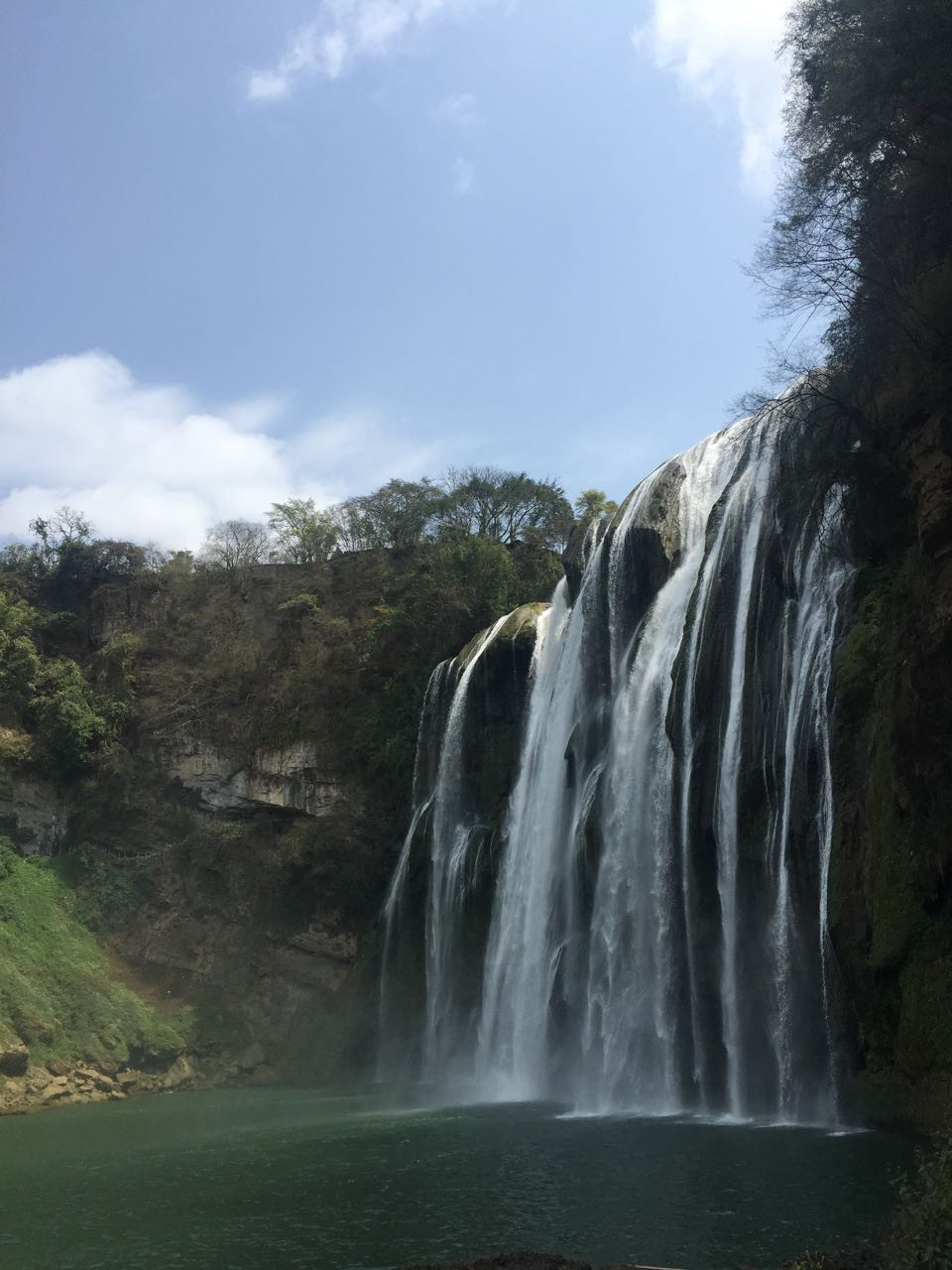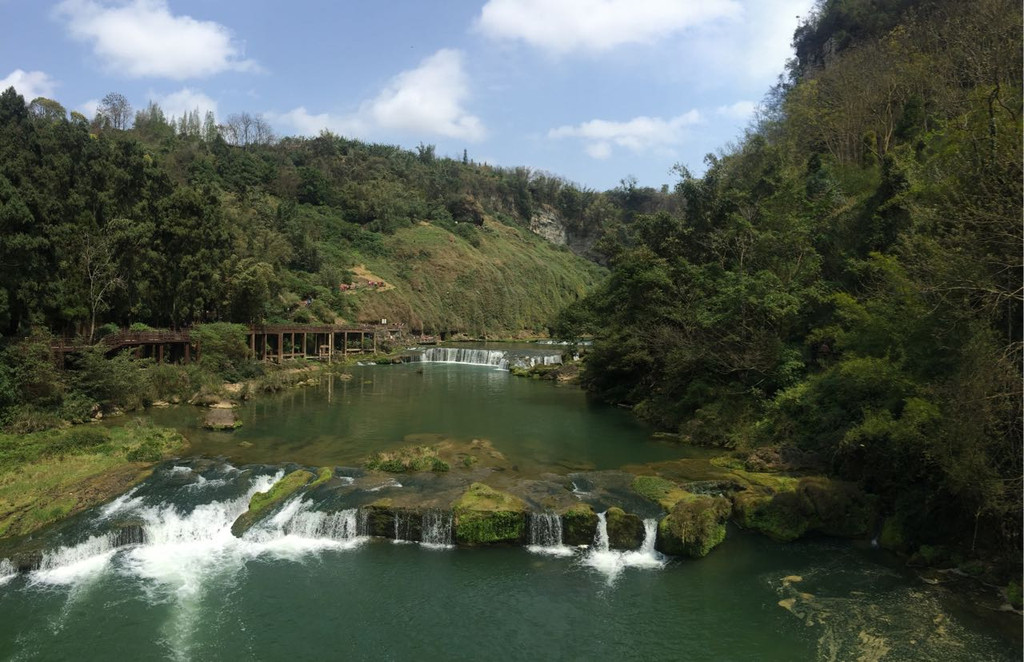 然后突然就能看到大瀑布的上端,能看到大瀑布顺流而下的景观,黄果树瀑布的特色之一就是能从上下左右前后看到瀑布,按正常的进入景区的方式,如果没有封路,很多人会漏掉上这个角度,在去大瀑布的路上有个上行的岔口,一直上行可以到这张照片的拍摄位置,但要注意,这不是上的观景台的位置,这个位置更高,而且这里有人守着,要检票的,往下走就算正式进入黄果树瀑布景区了,之后就可以按照正常的游览路线观看黄果树瀑布了,当然也可以反过来走,游玩完黄果树瀑布后,不回到出口,走上行的岔道出景区,一直走到陡坡塘;推荐前一种,第一眼从瀑布的上端看还是很有意思的;总路程差不多4、5公里吧;但要注意,过大路的时候会有人守着,会因为大雨后路不好走封闭,比如这次9月份我们就没走通,3月份的时候可以;所以这条路选择要慎重,可能会无功而返;最后游览天星桥;
