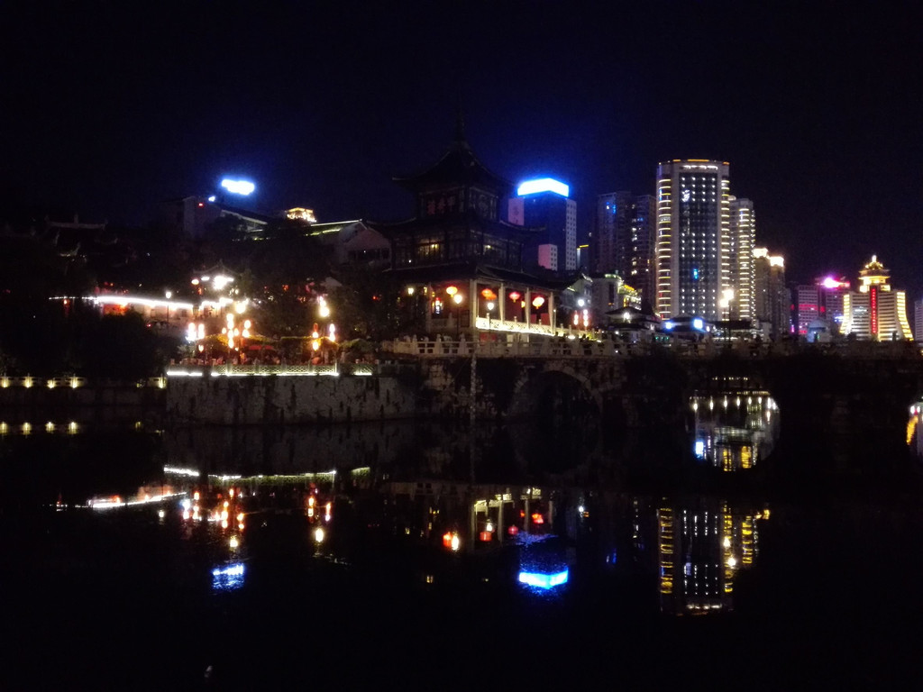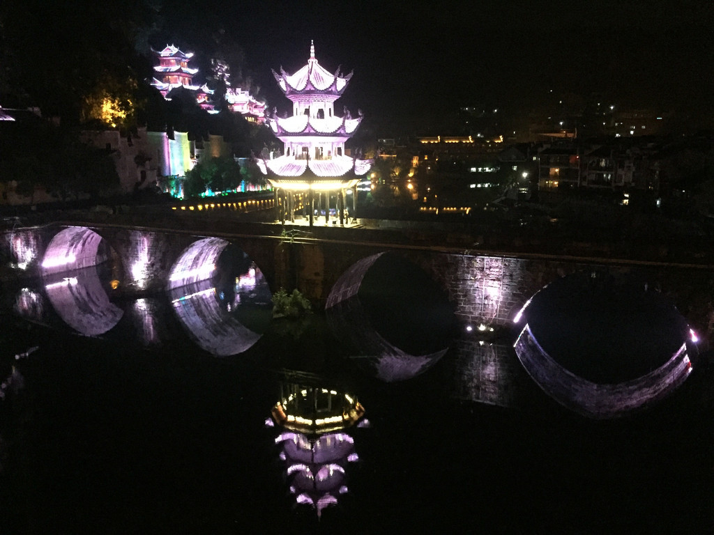 慢慢的雨停了,四下一片寂静,几乎没什么人在路上,江水没有一丝的波纹,如镜一般,祝圣桥和桥上的魁星楼完整的映在水面;青龙洞灯火阑珊,江边的民宿只有点点灯光,远处正好一列火车驶出涵洞,车厢长串的窗户也映在了江面上;就这样静静的坐着,静静的看着;