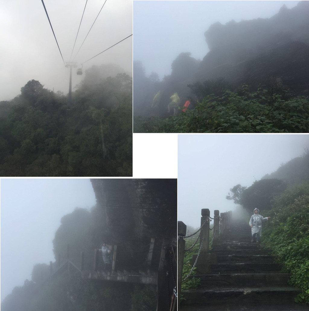 可以有两种方法上山,索道和爬8000多级台阶;天气虽然没有下雨,但是水汽很大,担心爬一半下雨,决定还是索道上吧;山顶索道到各个景点还有很长的距离,我们走了小环线,森林栈道到蘑菇石上老金顶,下来后再上红云金顶,从承恩寺、天街回到索道站;