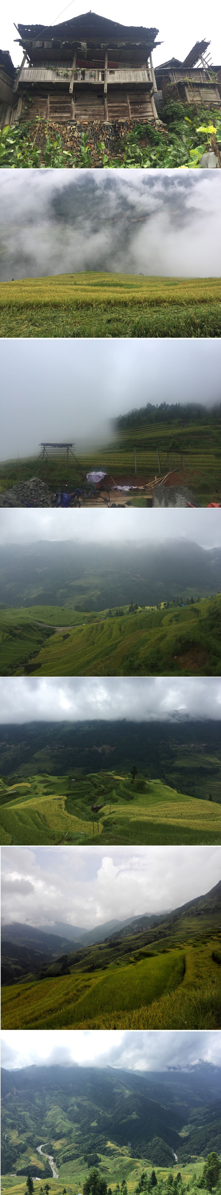 从村子里上行,老旧的吊脚楼屹立在藤蔓之中,有很多地方在开放了,准备建民宿了;沿着梯田的上沿走了一圈回到主路,雾气消散,阳光明媚,山川河流、梯田村子,看不完的景色;我们差不多走了3、4公里就折回了;
