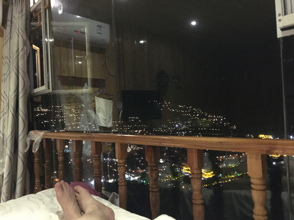 回到酒店,落地窗正对着夜景,躺着就能看,可惜不是像镇远古镇有个阳台;