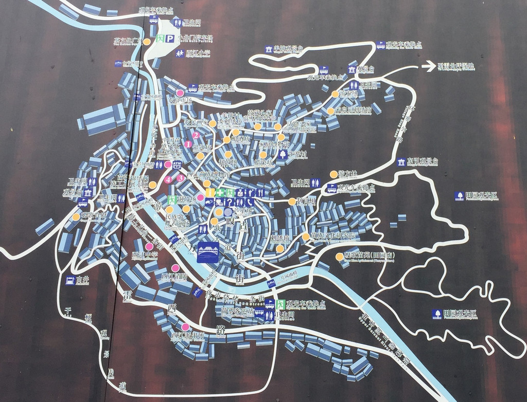 镇远古镇位于舞阳河畔,四面环山。河水以“S”形穿城而过,北岸为旧府城,南岸为旧卫城,远看像一个太极。两个城池都是明代所建,现存部分城墙和城门。古镇里城各种古建筑、传统民居200多处。