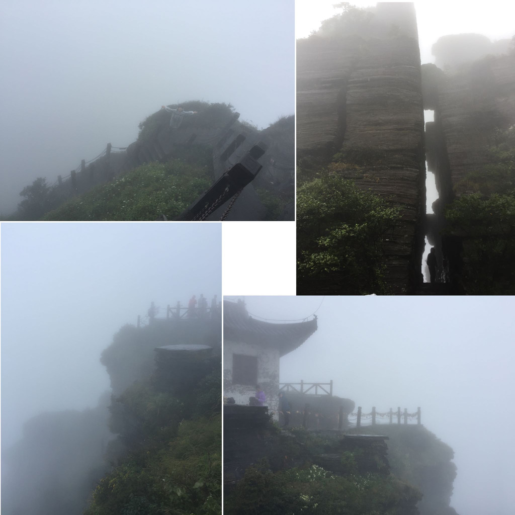 越往上水汽越大,最后雨披都用上了,感觉整个山都裹在雾中,20米开外人畜不分,10米开外雌雄难辨;老金顶与红云金顶相互完全看不到;梵净山为弥勒道场,云瀑、禅雾、幻影、佛光是梵净山的四大天象奇观,但这雾也太大了点吧;