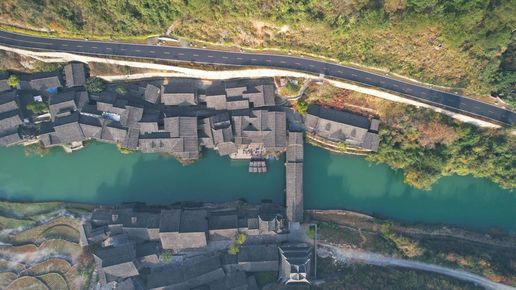 随着时间的推移,湛蓝的天空下,暖 阳高 照,原本如墨色晕染的乌江寨,也在金色阳光的照耀下显得愈发明亮动人。那江畔两岸一座座黑褐色的黔北木屋,像是两条蟠龙仰卧山水之间。而静静流淌的乌江水,则像是一条灵动闪耀的绿腰带。碧绿的江水与黑褐色的木屋,正是一幅浑然天成的唯美画卷。