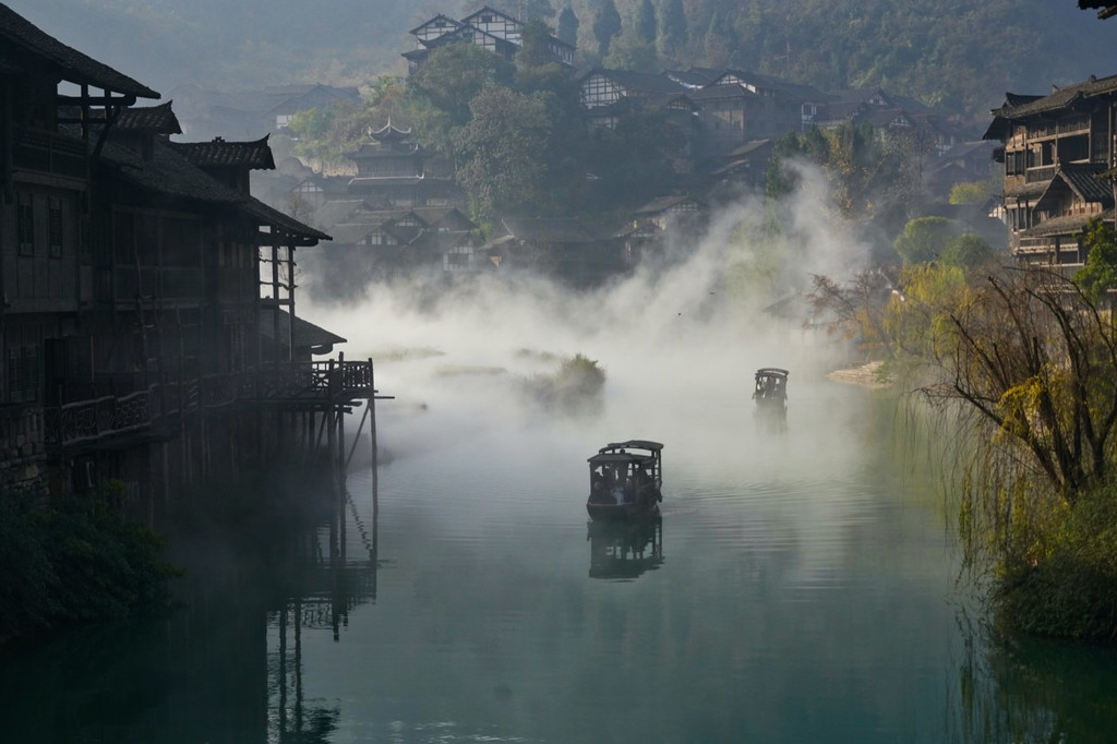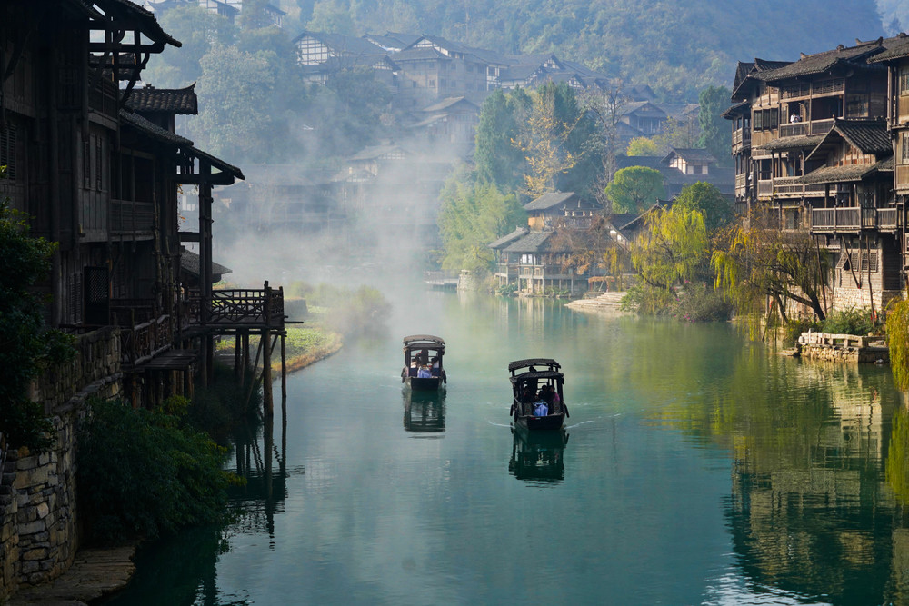 清晨,一团团云雾飘荡在乌江水面之上。在码头乘坐一艏乌篷船,船行划破静寂的水面,微波荡漾,穿过层层云雾,乌篷船也隐于山水之中,彷佛成为了画中的一笔。行船游江,在船上享用丰富营养的乌江寨特色早餐,视觉与味觉都得到了极大地满足。