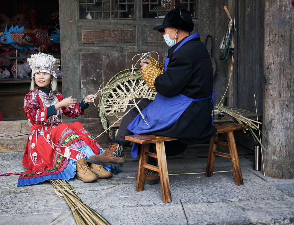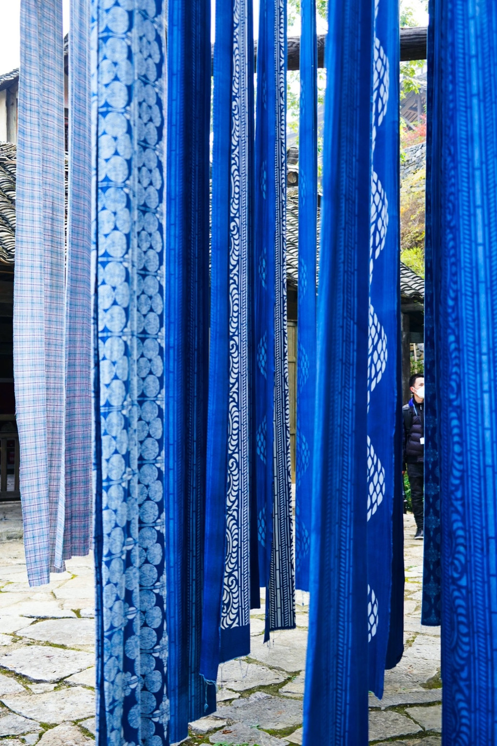拾级而上,来到乌江寨尤为文艺的 和平 染坊。在这里可以看到各类布料和染制工艺,门店内陈列了精致的纺织品,可供游人选购。在作坊内展有黔北蜡染的工艺流程,如果想要深入了解蜡染工艺的魅力,还可亲手制作蜡染。