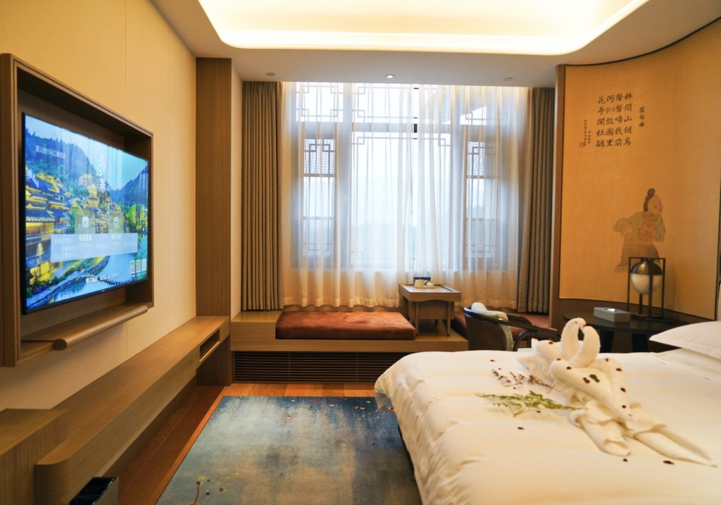 暮山酒店与乌江寨的传统建筑相结合,简约大气的酒店环境,令人心情舒畅。每一间房间都是经过精心布置的,躺进松软的大床,褪去旅途的疲惫。我喜欢宅暮山酒店的时光,只因可以靠窗而坐,拉开纱帘,可看乌江寨山色空蒙,或是隔窗远望,看那山顶的洁白如玉的廻龙塔,抬眼之间,皆有风景可看。看山色,虚度时光。
