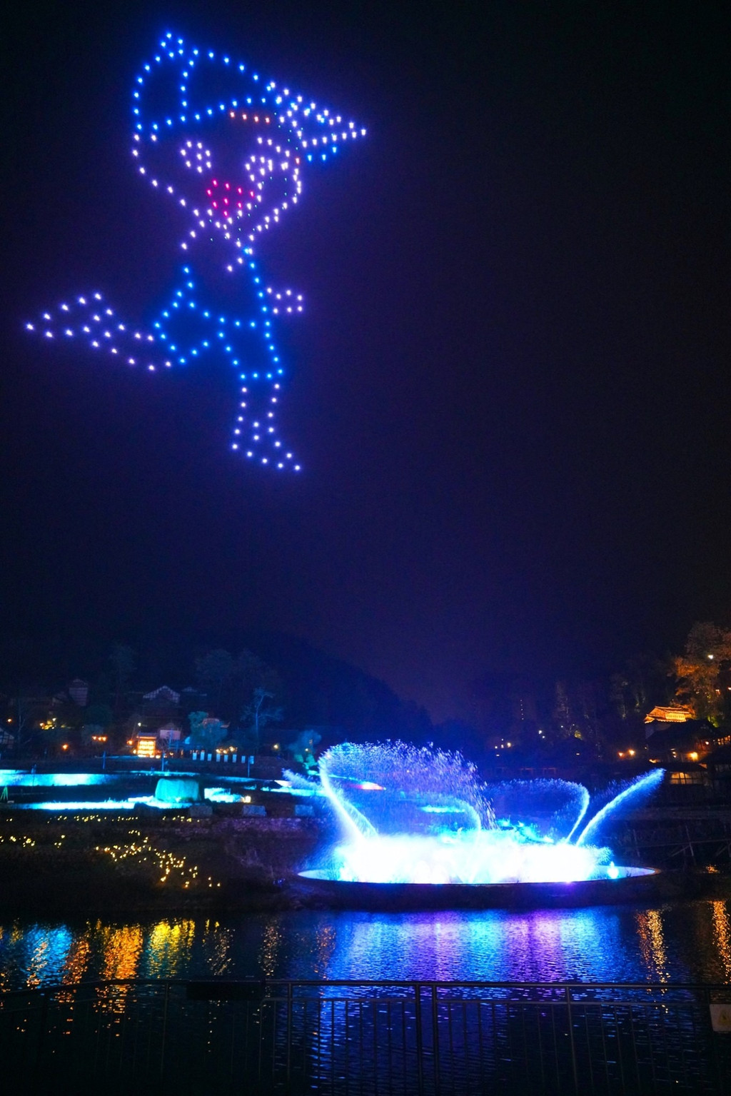 如果你问,乌江寨到底有多会“宠人”搞浪漫?我不想言语,只想带你看一次乌江寨的无人机表演,你便知被景区“宠爱”有多幸福。当一架架无人机在梯田上慢慢腾空,在星光闪烁下变换色彩,组成蝴蝶展翅、苗族少女、乌篷船……千变万化的形态,令人眼花缭乱。随后还有浪漫至极的孔明灯,迎风缓缓爬上天空。你在脑海中幻想千万遍的画面,在这里抬头便能瞧见。
