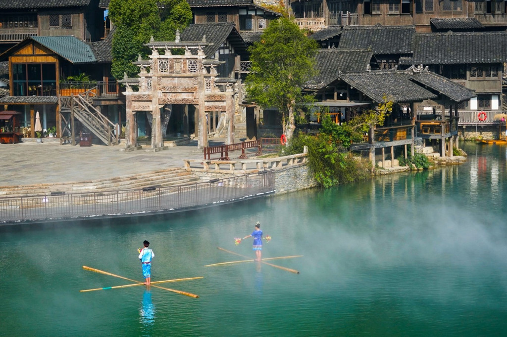 白天里乌江之上,还有精彩纷呈的“独竹漂”表演。这是 贵州 非遗名录,也是黔北的民间绝技,十分精彩,不容错过。一根普普通通的竹竿之上,还能展示古典舞,令人叹为观止。