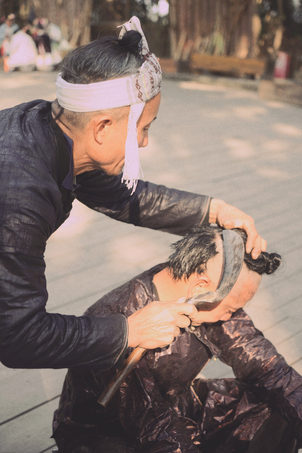 这种发髻可以用镰刀剃出来,也是算传统技能之一,这次正好看到,真是技艺高超,速度快,手稳,一会就成。