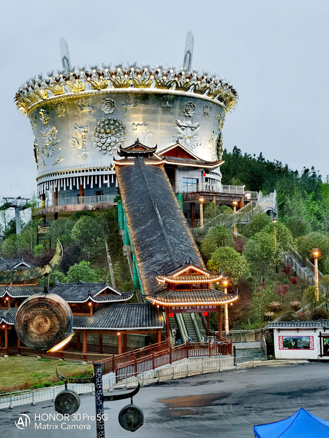 进入西门搭乘观光车广场,首先映入眼眸的是黔东南苗族文化地标性建筑之一的世界上最大的——银帽子,高17米,宽8米。