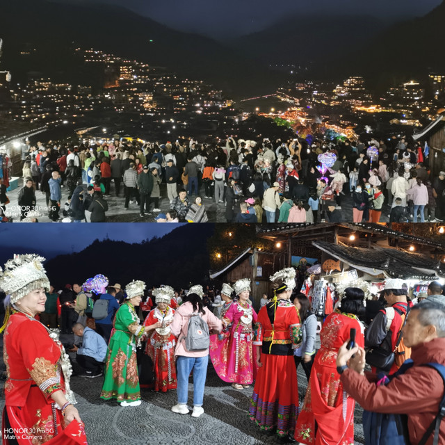 观景台不大,游客为观赏千户苗寨夜景,人挤人早已排了多层,不少女性则穿着苗族服饰在此打卡留影或拍抖音,呈现出各具特色的千户苗寨夜景。