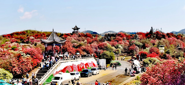 站在观景台眺望蓝天丽日下繁花似锦的杜鹃花丛,观此景即舒心又怡情。