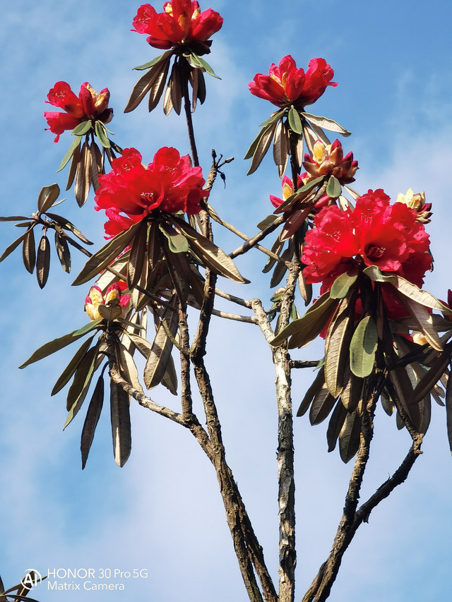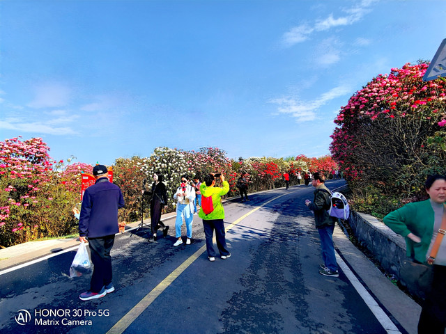 此刻,旭阳映照下的观光路上已有不少游客。在两侧山坡上长满着粗壮杜鹃树,枝枝上簇拥着茂密的五颜六色杜鹃花。