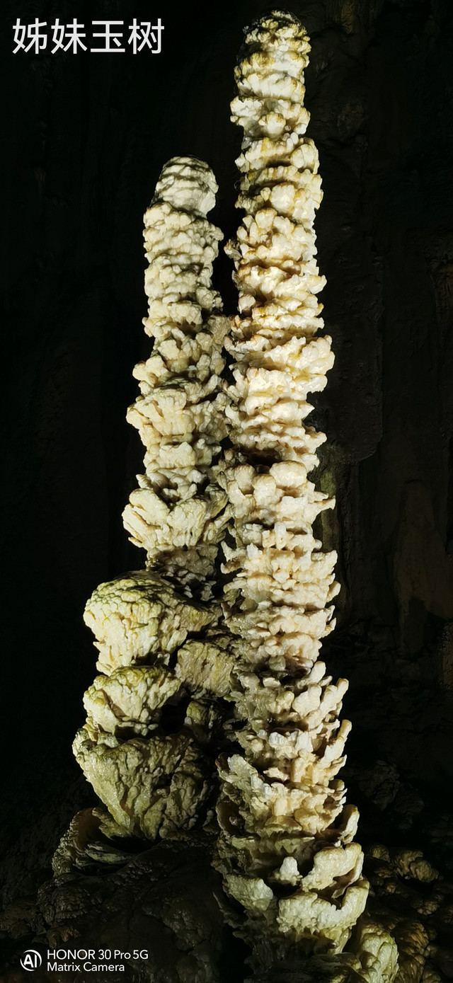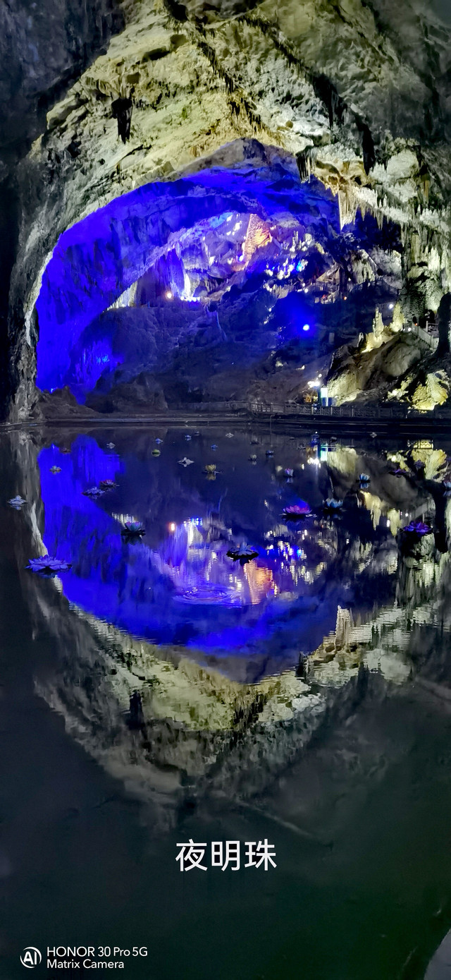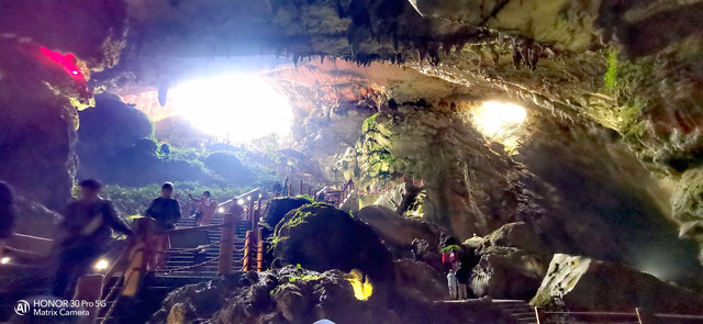 进入洞口回望此景,被景区誉为“日月同辉”,是指洞顶上的一大一小两个天然小洞口,阳光从洞口透进来,形成太阳和月亮同时辉映的景象。