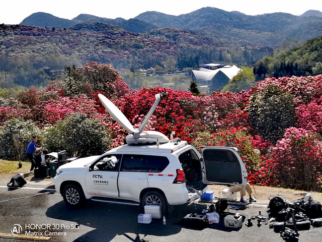 步行来到五彩亭景点,亭台下面观光路停靠一辆车,仔细看是一辆央视摄影车,听说他们来此拍摄百里杜鹃已有几天了,这辆车重达2.9吨,可见车载的摄影器材不少且非常贵重。