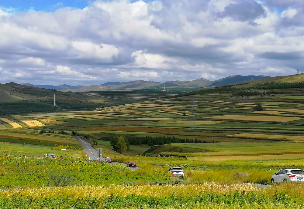 我们是9月10日从北京出发,当晚住在张家口,游览了大境门和张家口堡。11日在野狐岭上张北草原天路,据当地人讲草原天路的前身是修建风电开拓的简易土路,后来为开发旅游加工成油路并联通。在张家口乘出租车时司机讲现在是草原天路风景的最佳观赏期,因为庄稼都熟了一片金黄,草地仍然是绿色的,山谷之中色彩张扬,蓝天点缀白云引人入胜。张北草原天路基本在手机导航范围,路标也清晰。张北草原天路在桦皮岭结束,从老虎沟走335国道向北不到一公里右转经桦皮岭张承高速收费站(不上高速)沿一条小油路左转在石头沟再上沽源草原天路。两部分草原天路衔接段标示不清,很多人在这里走错,如果导航的目的地是沽源,语音就提示你走高速,实在找不到就停车问问,老乡会热情地给你指路。
