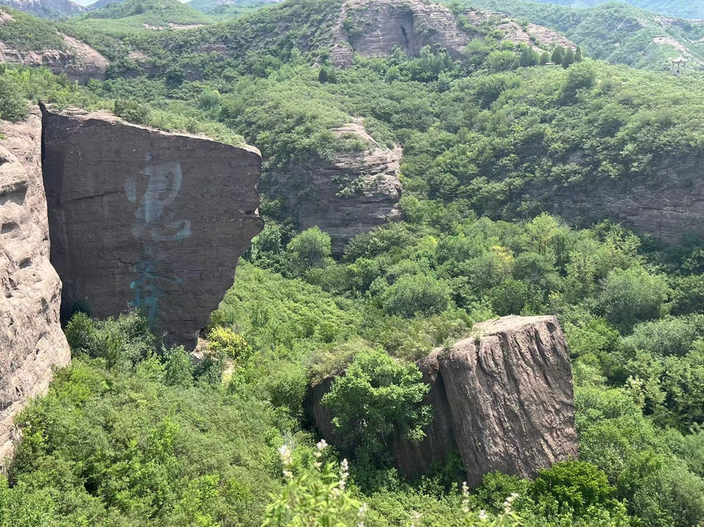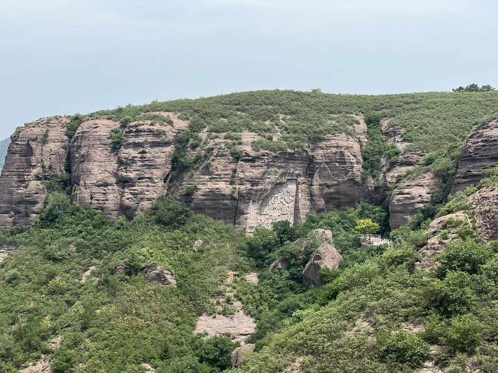 鬼斧神工。大型摩崖石刻。一块巨石垂直裂开,分成两块,彰显了大自然的神工。一块刻有“鬼斧”,另一块刻有“神工”。断壁高24.3米,宽约19米,“鬼斧”两个字面积近百平方米。